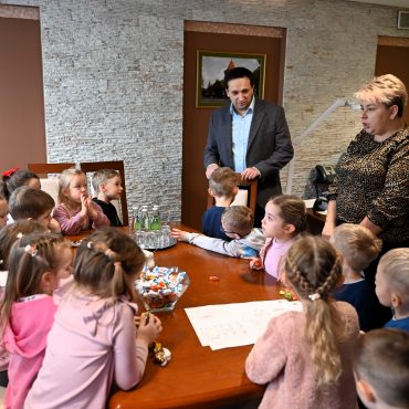 Kilkunastoosobowa grupa dzieci z Przedszkola Samorządowego Nr 1 w Brzozowie odwiedziła dzisiaj Urząd Miejski. Przedszkolaki spotkały się z Burmistrzem Brzozowa Szymonem Stapińskim, który opowiedział o pracy w urzędzie i chętnie odpowiadał na zadawane przez dzieci pytania.