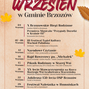 Zapraszamy do zapoznania się z wrześniowym harmonogramem wydarzeń sportowo-kulturalnych w Gminie Brzozów. Zapowiada się piękna, słoneczna jesień.