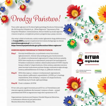 Oddział Terenowy Krajowego Ośrodka Wsparcia Rolnictwa informuje o trwającym naborze zgłoszeń do IX edycji Ogólnopolskiego Konkursu Kulinarnego dla Kół Gospodyń Wiejskich pn. „Bitwa Regionów”. Aby wziąć udział w konkursie, należy wysłać zgłoszenie drogą elektroniczną do 5 maja 2024 r. poprzez wypełnienie formularza dostępnego na stronie www.bitwaregionow.pl.