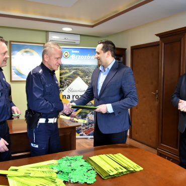W trosce o bezpieczeństwo dzieci i młodzieży na drogach, Burmistrz Brzozowa Szymon Stapiński przekazał na ręce Komendanta Powiatowego Policji w Brzozowie insp. dr. Mariusza Skiby oraz asystenta Referatu Ruchu Drogowego KPP w Brzozowie asp. szt. Wiesława Jurka kilkaset elementów odblaskowych.