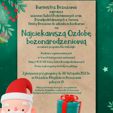 Burmistrz Brzozowa zaprasza uczniów ze Szkół Podstawowych oraz Ponadpodstawowych z terenu Gminy Brzozów do wzięcia udziału w konkursie plastycznym na „Najciekawszą ozdobę bożonarodzeniową” wykonaną z recyklingu.