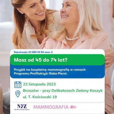 Od 1 listopada 2023 roku więcej Polek będzie miało możliwość skorzystania z mammografii w ramach Programu Profilaktyki Raka Piersi finansowanego przez NFZ. Przedział wiekowy Pań uprawnionych do badania w programie został poszerzony o 10 lat. Panie mogą nadal wykonać bezpłatną mammografię w dowolnej lokalizacji, niezależnie od swojego miejsca zamieszkania i bez skierowania lekarskiego.