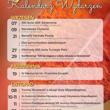 Przed nami wyjątkowy czas imprez kulturalnych i sportowych. Z radością przedstawiamy Jesienny Kalendarz Wydarzeń 2025. Szczegóły już wkrótce. Śledźcie nasze media społecznościowe i stronę internetową www.brzozow.pl. Niebawem więcej informacji. Szczegóły na plakacie poniżej.