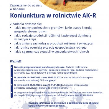 W dniach 15 -19 lipca br. na terenie całej Polski przeprowadzone zostanie Badanie Koniunktury w Gospodarstwach Rolnych (AK-R). Badanie dostarcza informacji o tym jak rolnicy oceniają przeszłą i bieżącą koniunkturę oraz prognozują jej zmiany w następnym półroczu.
