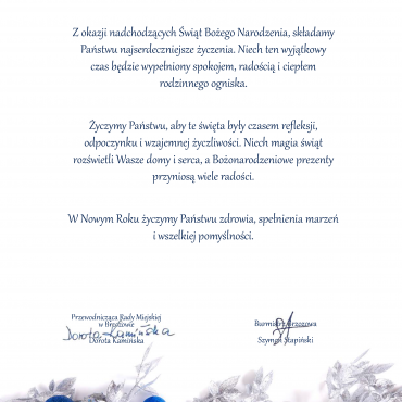 Burmistrz Brzozowa Szymon Stapiński oraz Przewodnicząca Rady Miejskiej w Brzozowie Dorota Kamińska składają życzenia świąteczne Mieszkańcom Gminy Brzozów.