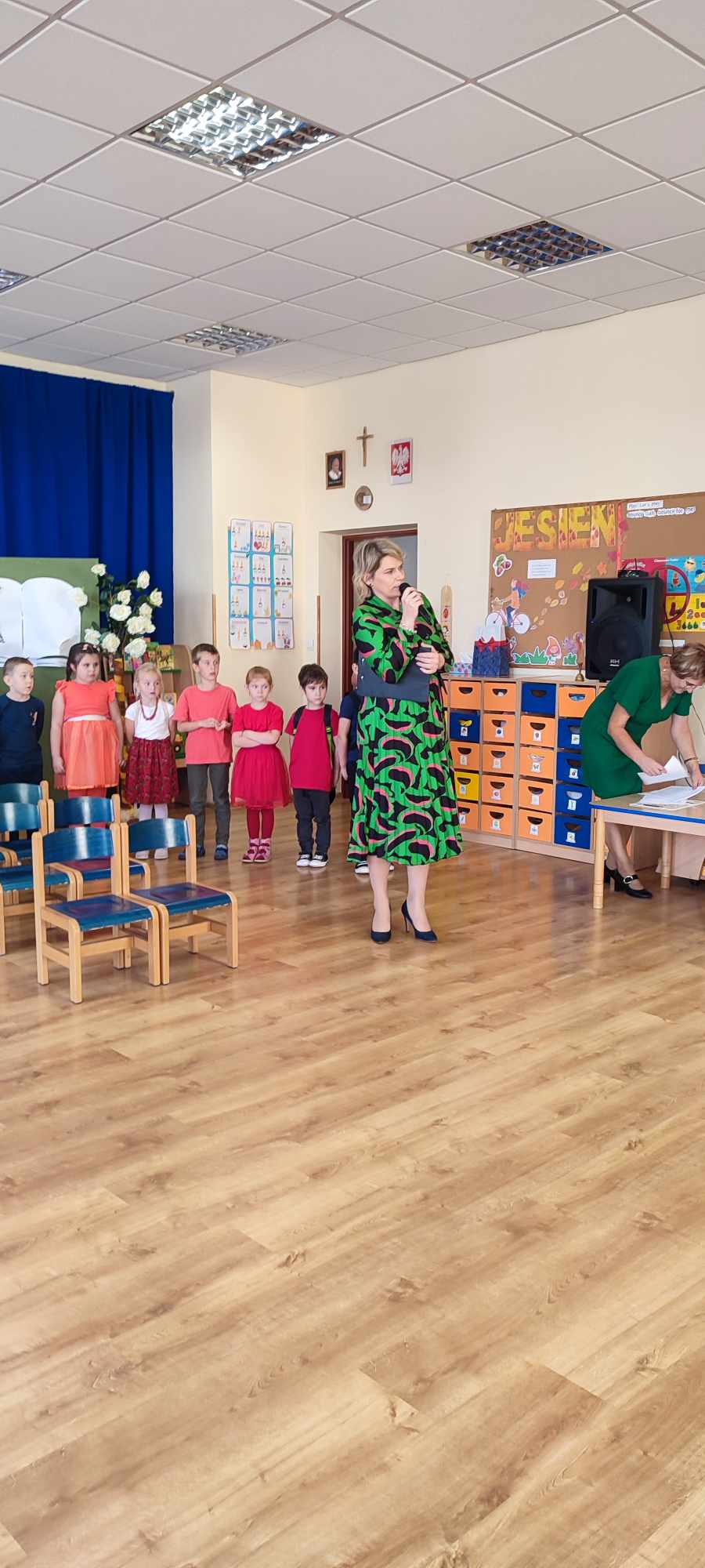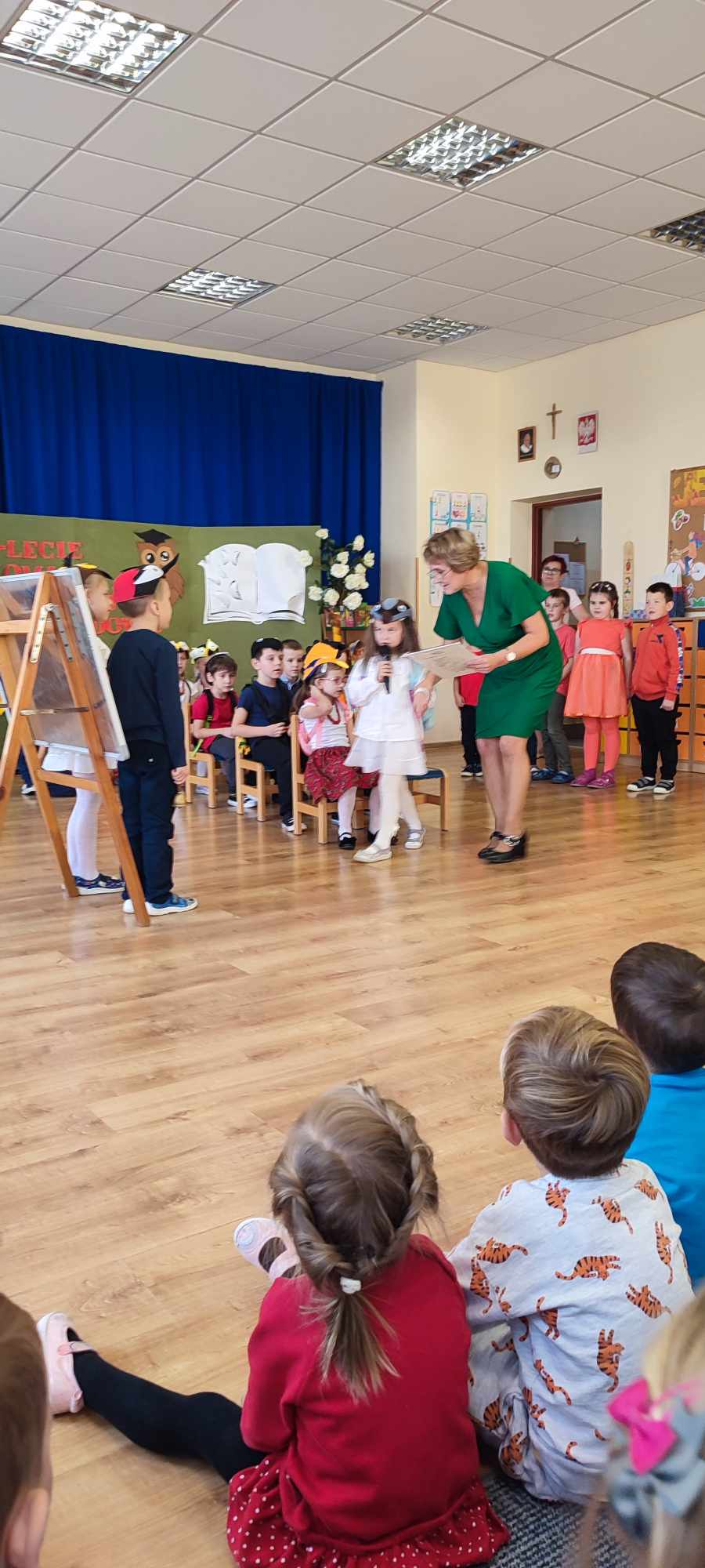 Zgromadzonych gości przywitała pani dyrektor Małgorzata Florczak, która w kilku słowach przypomniała wszystkim, że bycie nauczycielem nie jest jedynie profesją, ale całożyciową misją. Pani dyrektor wyróżniła za pracę na rzecz środowiska lokalnego i zaangażowanie dwoje nauczycieli wręczając im nagrody dyrektora. Zebrani goście, emerytowani nauczyciele, pracownicy placówki i przedszkolaki z przyjemnością obejrzały występ dzieci z oddziału Biedronki, które zaprezentowały inscenizację do utworu „Jak wróbelek Elemelek w szkole uczył się literek”. Dzieci do występu przygotowała pani Celina Wolanin.