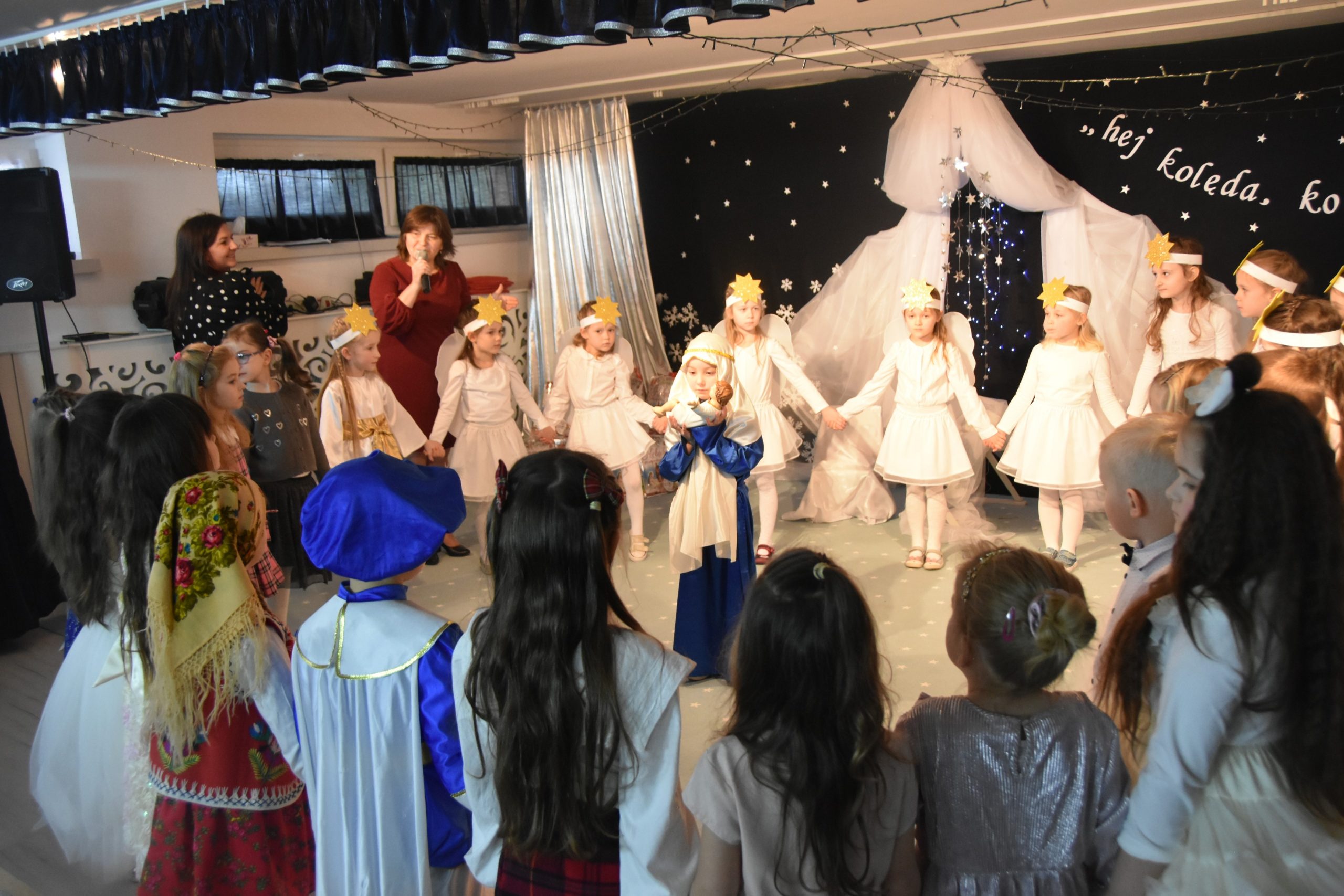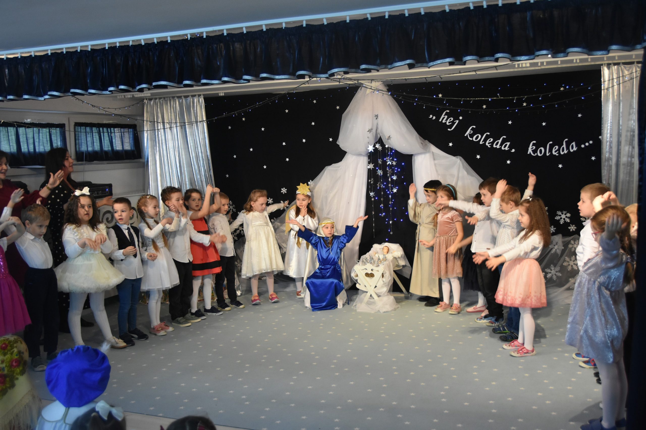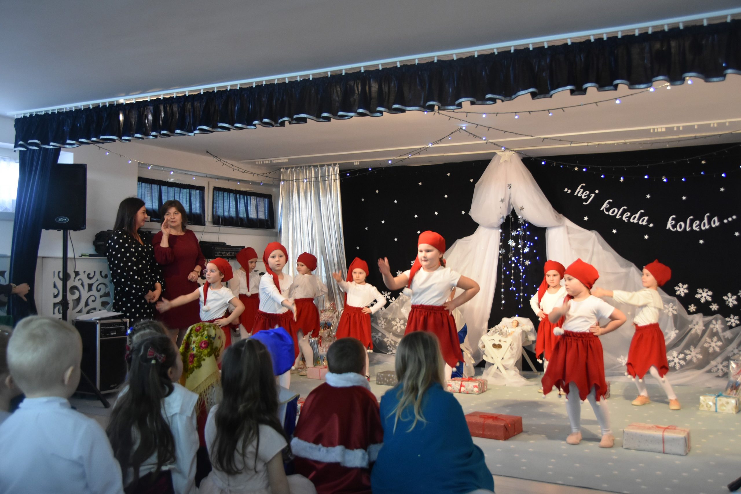 Dalszą część przeglądu poprowadziła pani Teresa Nogaj, która jednocześnie czuwała nad jego prawidłowym przebiegiem. Niezwykle zimowy, świąteczny i podniosły charakter uroczystości podkreślała piękna scenografia. Na scenie oprócz wykonawców kolęd pojawiły się dzieci z grup: ,,Odkrywcy”, ,,Motylki’’, ,,Sportowcy”, które zaprezentowały się w scence ,,Przy żłóbku’’, kolędach, okolicznościowych piosenkach i tańcach. Punktem kulminacyjnym części artystycznej był niosący przesłanie miłości taniec z sercami.