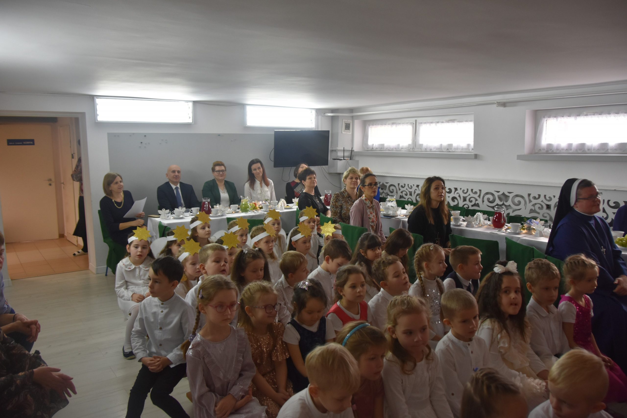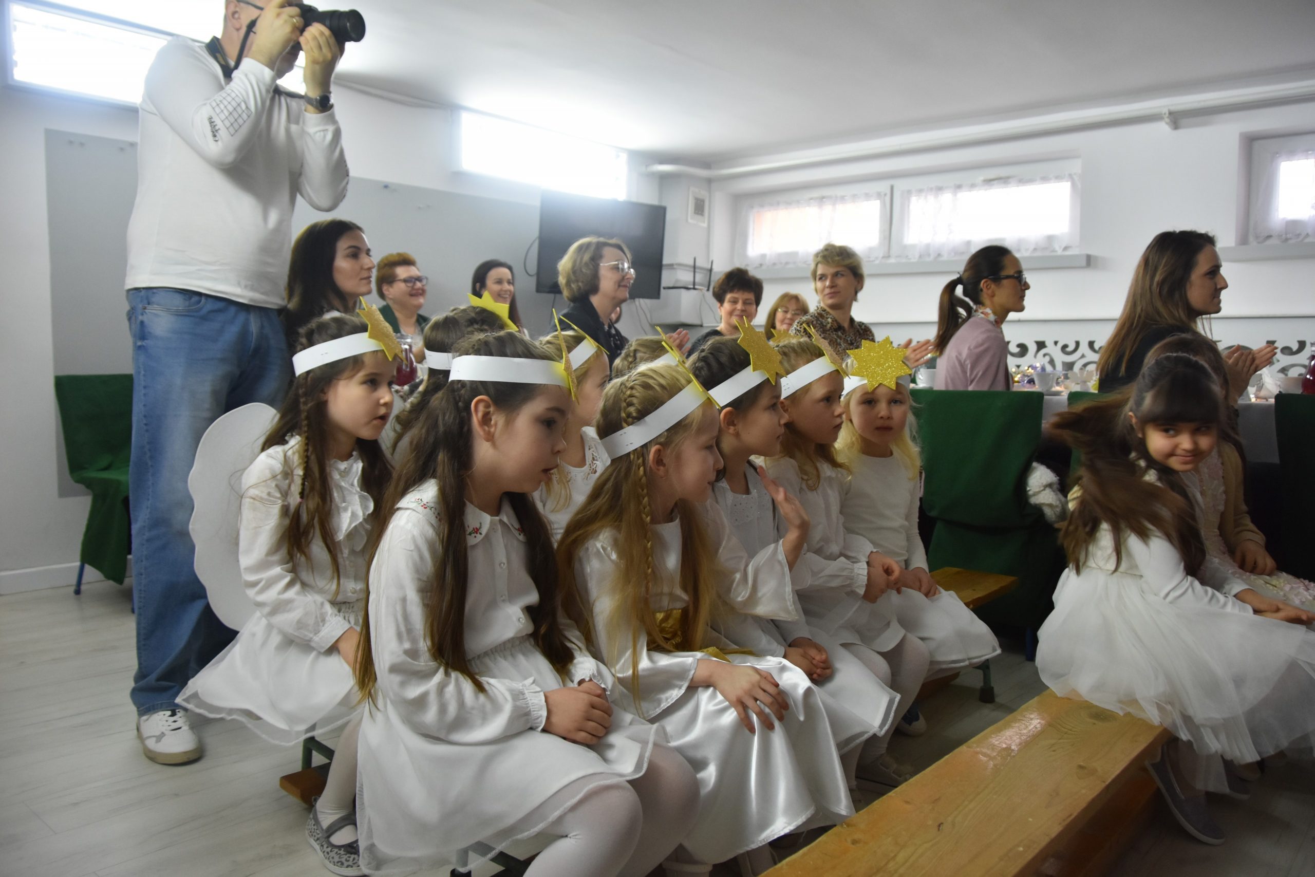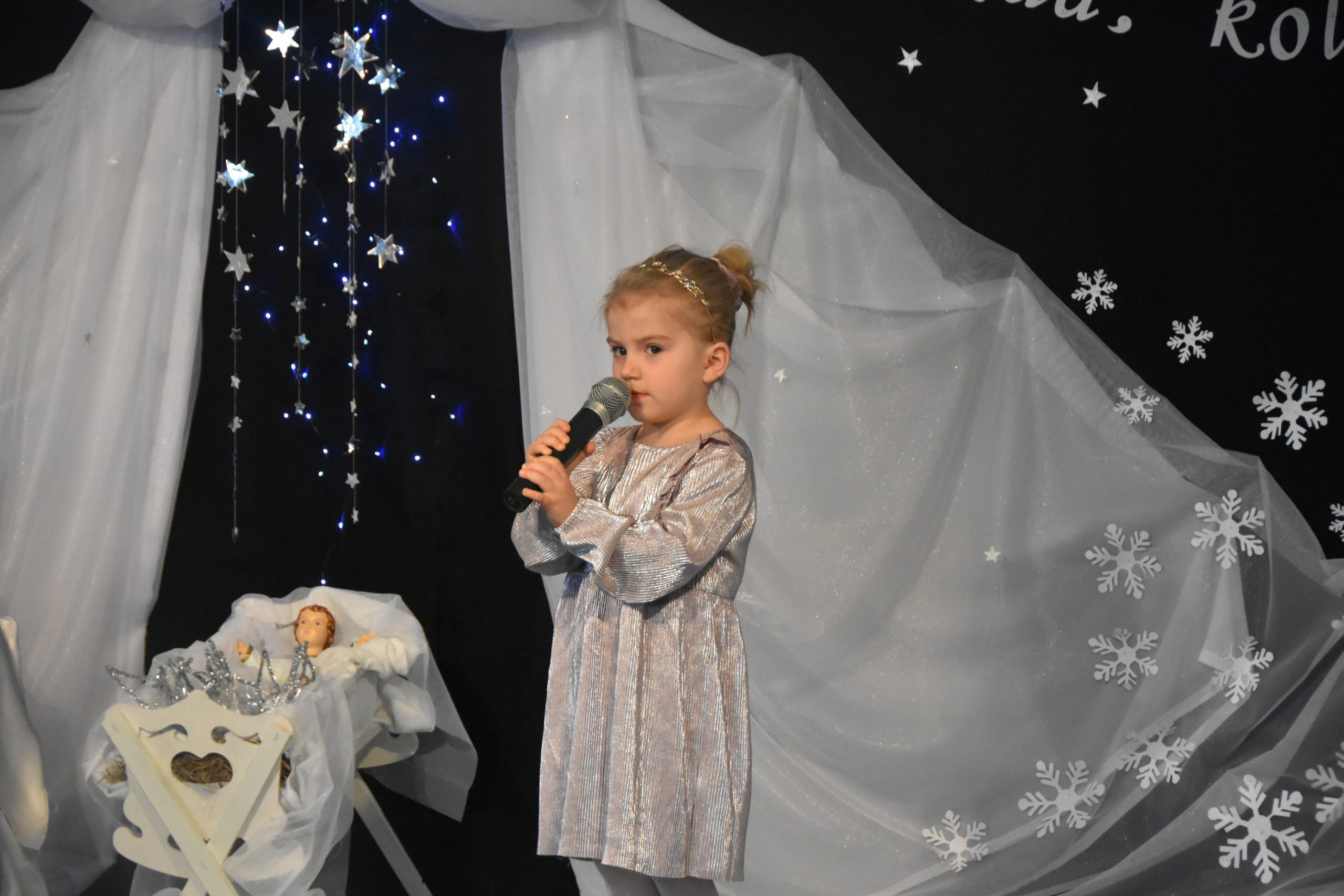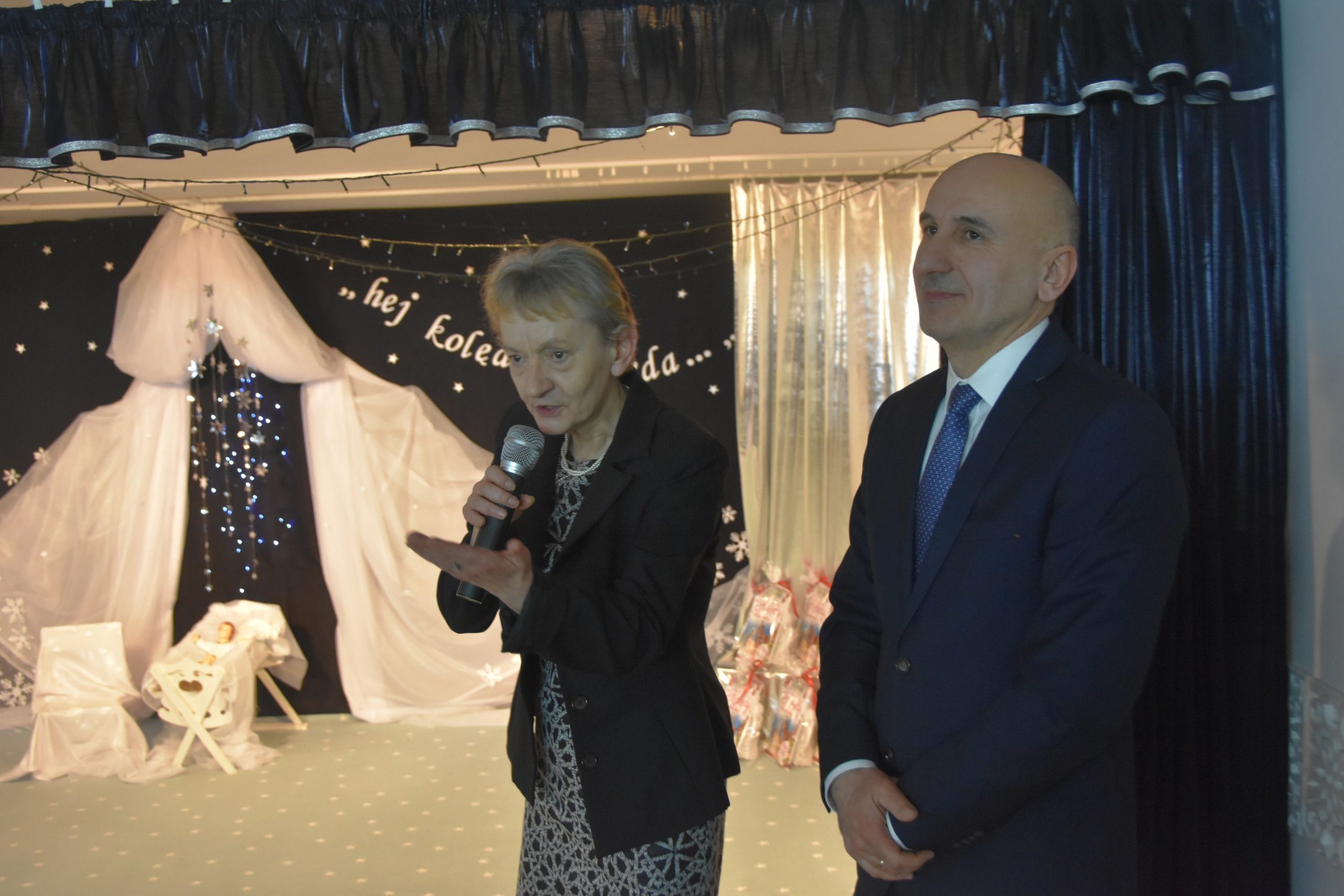 Dalszą część przeglądu poprowadziła pani Teresa Nogaj, która jednocześnie czuwała nad jego prawidłowym przebiegiem. Niezwykle zimowy, świąteczny i podniosły charakter uroczystości podkreślała piękna scenografia. Na scenie oprócz wykonawców kolęd pojawiły się dzieci z grup: ,,Odkrywcy”, ,,Motylki’’, ,,Sportowcy”, które zaprezentowały się w scence ,,Przy żłóbku’’, kolędach, okolicznościowych piosenkach i tańcach. Punktem kulminacyjnym części artystycznej był niosący przesłanie miłości taniec z sercami.