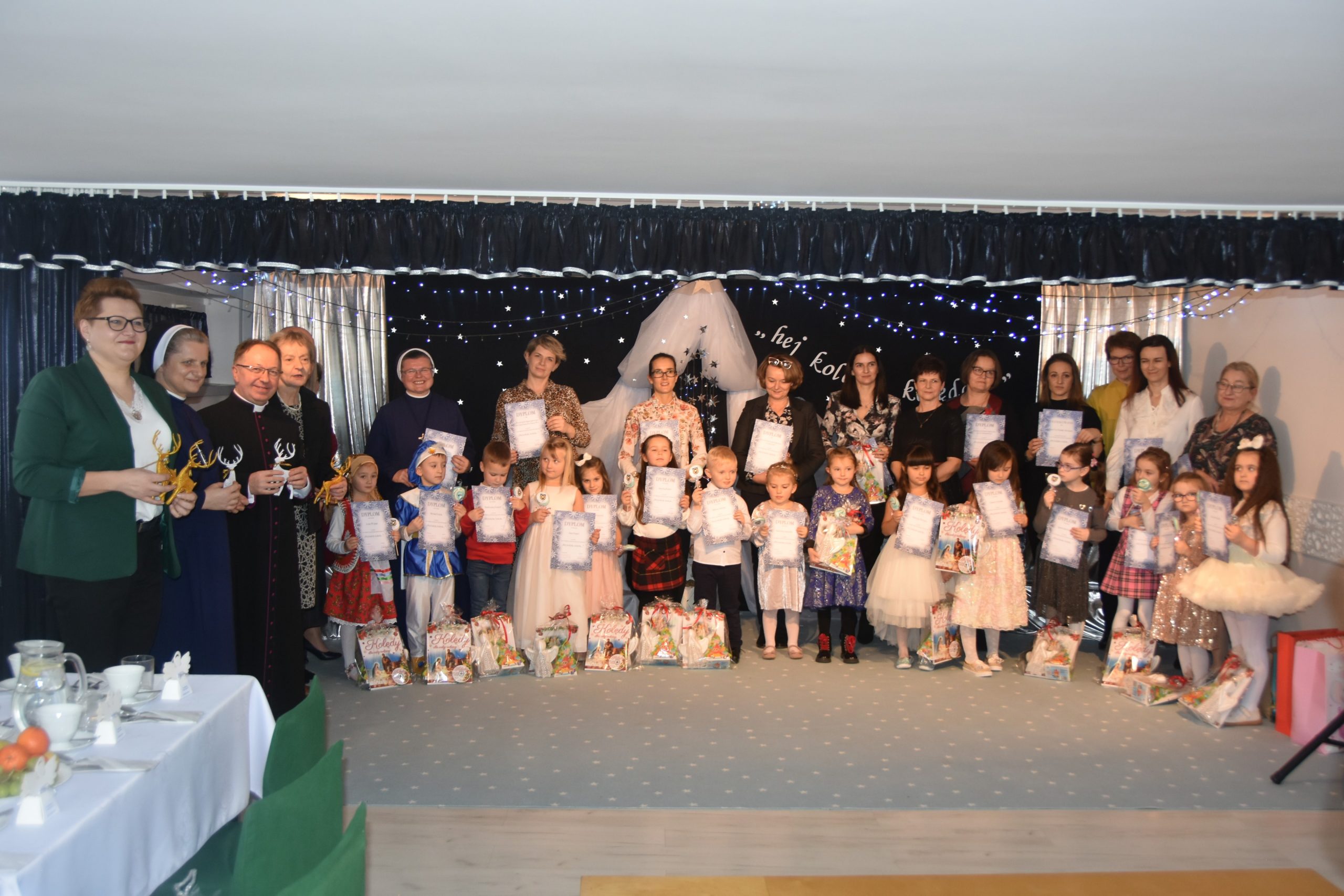 Zgromadzona publiczność włączała się do wspólnego śpiewu kolęd, co wpłynęło na miłą, radosną atmosferę uroczystości. Wszystkie przedszkolaki zaprezentowały się bardzo ładnie i niezwykle uroczo. Piękne stroje, rekwizyty, a przede wszystkim śpiew spowodowały, że był to prawdziwy koncert. Dostrzegli to słuchający i nagrodzili uczestników spotkania gromkimi brawami. Skierowali również słowa podziękowania, uznania i gratulacje dla dzieci, opiekunów oraz organizatorów przeglądu. ,,Mali artyści’’ otrzymali dyplomy, a także nagrody rzeczowe w postaci aniołka i książki z kolędami, przygotowane przez gospodarzy.