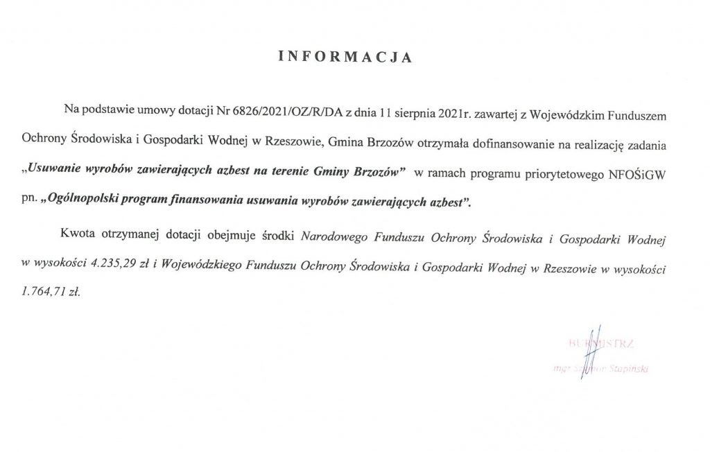 Gmina Brzozów otrzymała dofinansowanie na realizację zadania „Usuwanie wyrobów zawierających azbest na terenie Gminy Brzozów” w ramach programu priorytetowego NFOŚiGW pn.” Ogólnopolski program finansowania usuwania wyrobów zawierających azbest”.