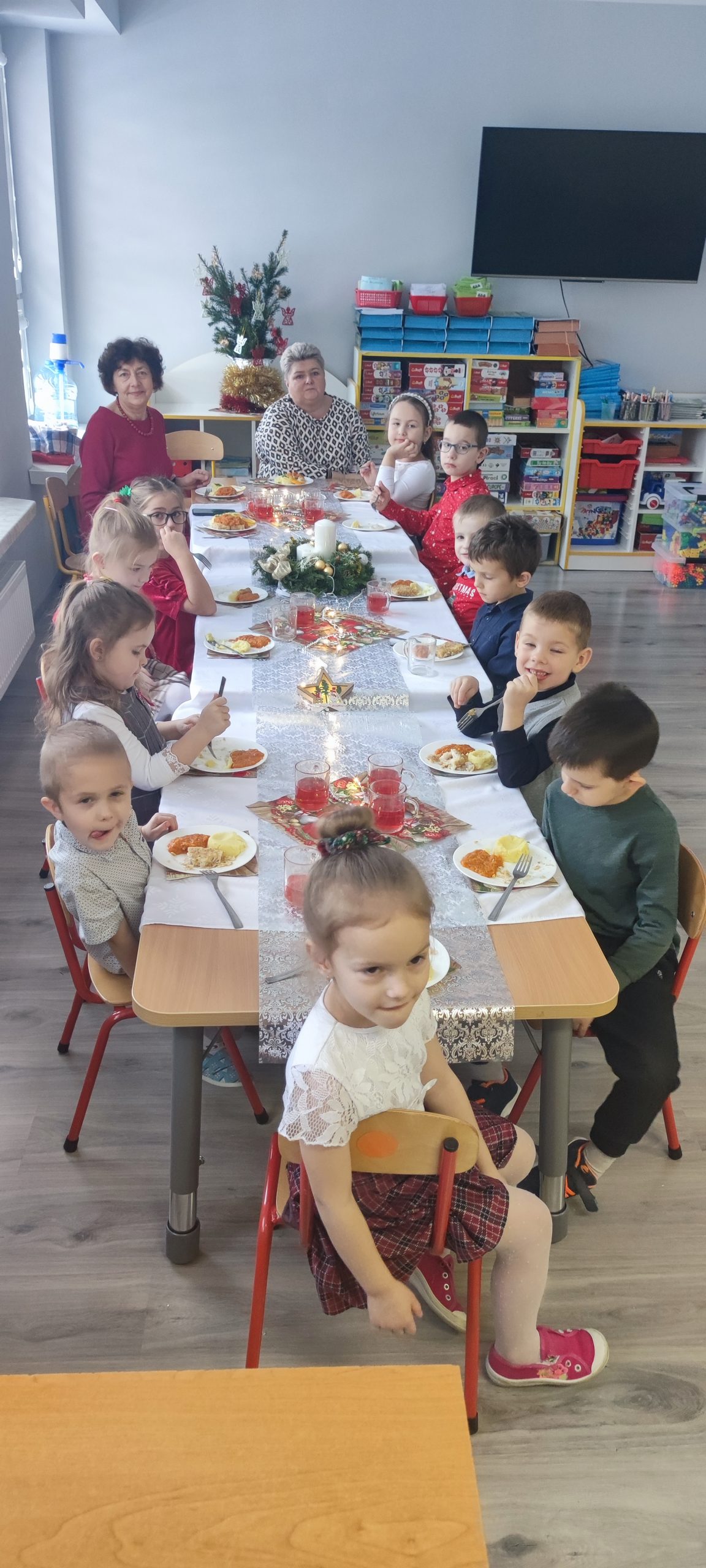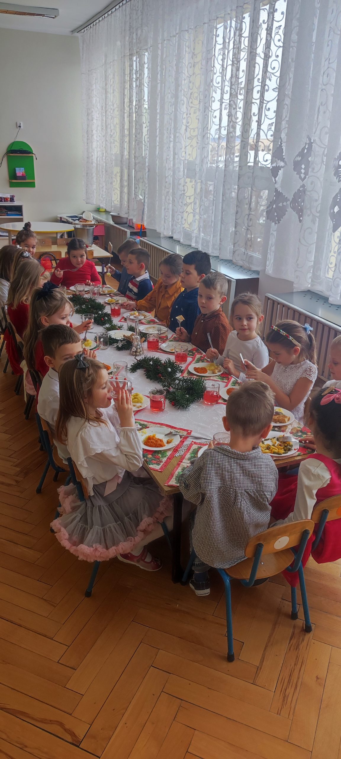 Po obejrzanych Jasełkach wszyscy zaproszeni Goście wysłuchali Ewangelii wg Św. Łukasza o narodzeniu Jezusa, połamali się opłatkiem, złożyli sobie życzenia i usiedli do wigilijnego stołu. Tego dnia do przystrojonych stołów zasiadła również cała społeczność przedszkola. Dzieci dzieliły się opłatkiem, życzyły sobie wesołych świąt i wspólnie z Paniami kolędowały dla małego Jezuska.
