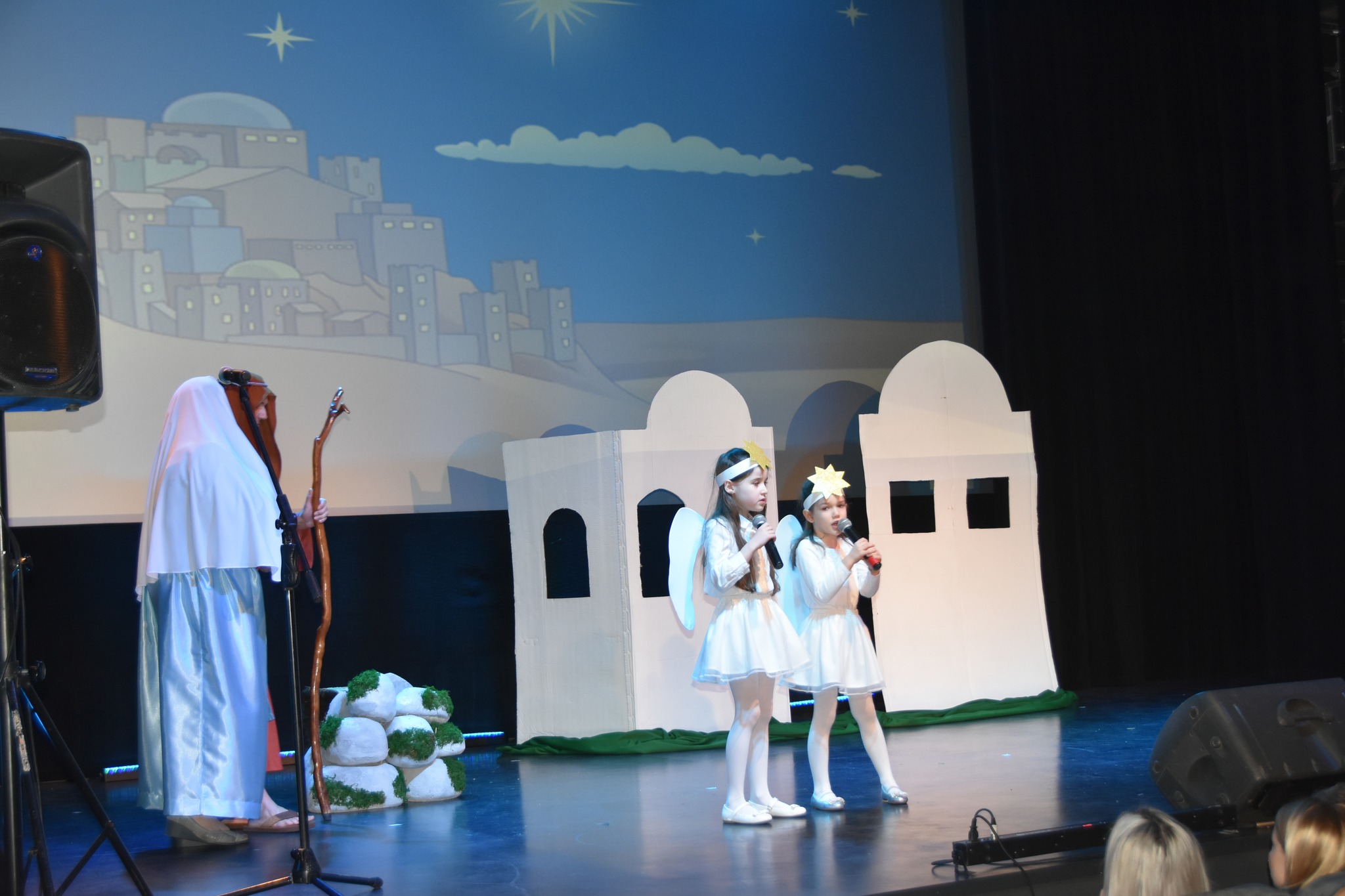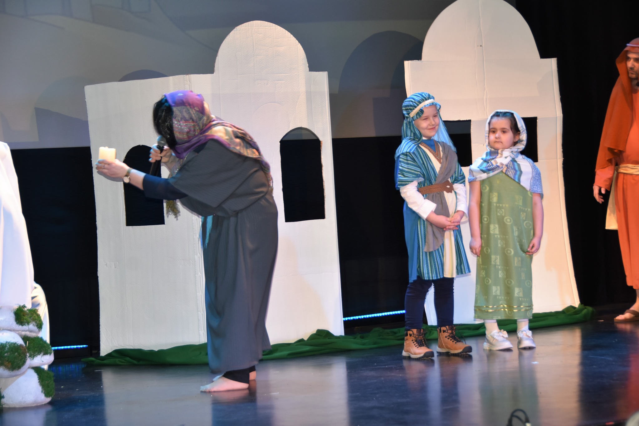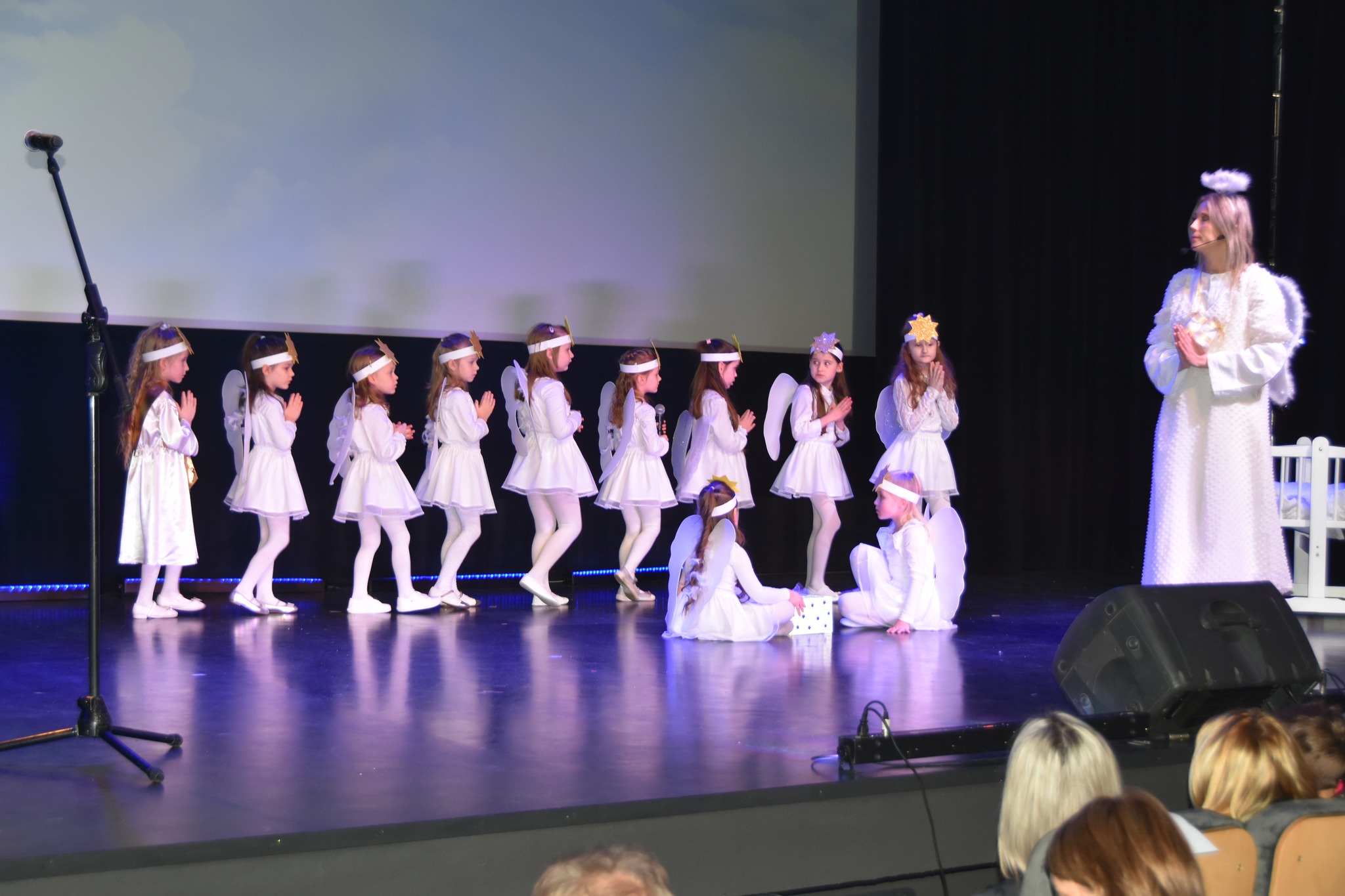 Grupa dzieci w strojach jasełkowych wystepuje na scenie.