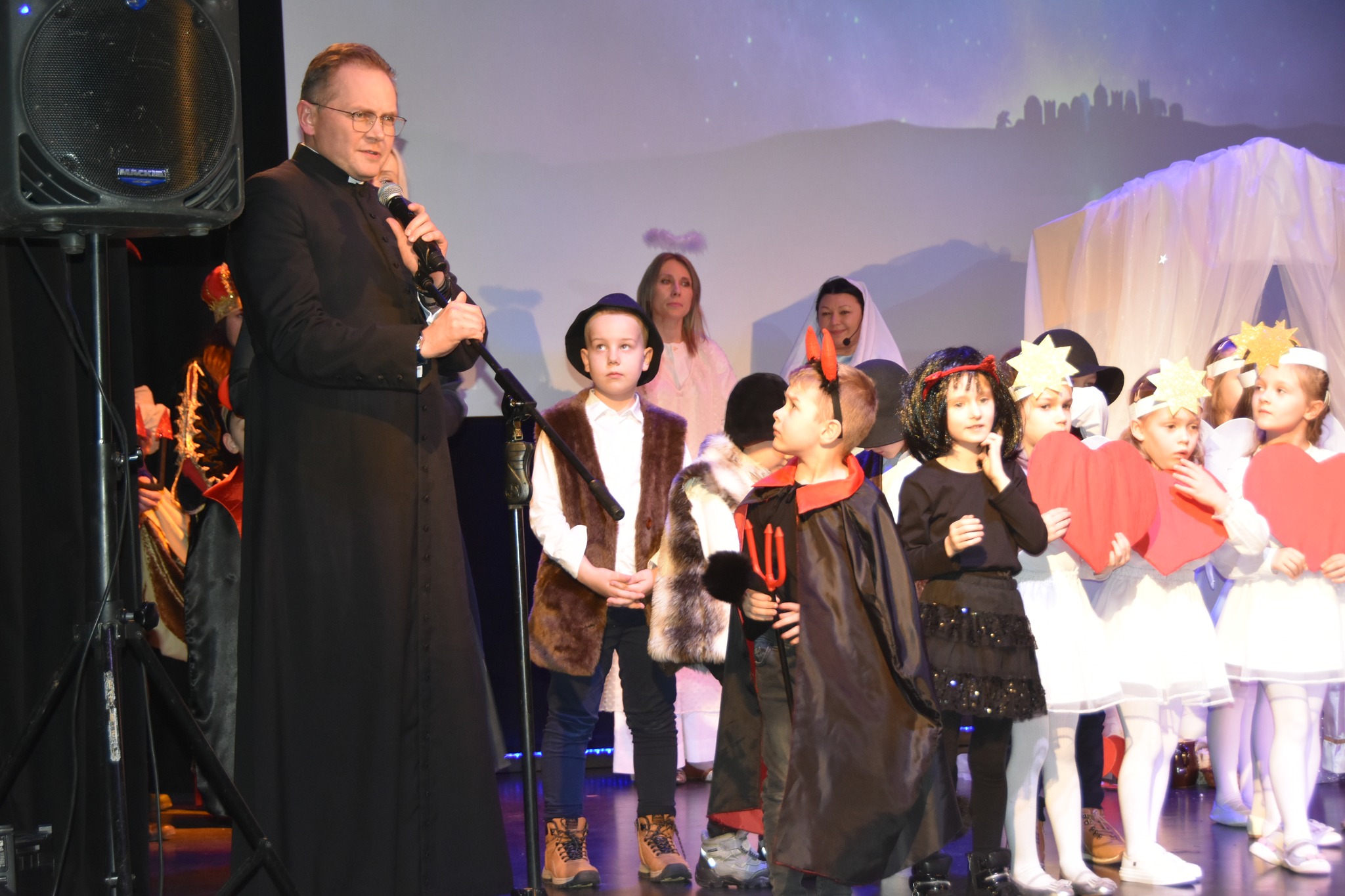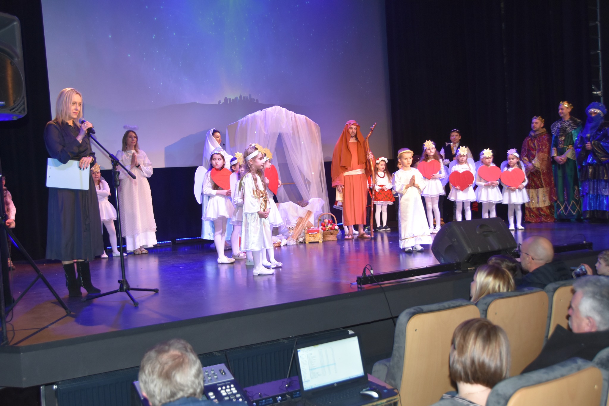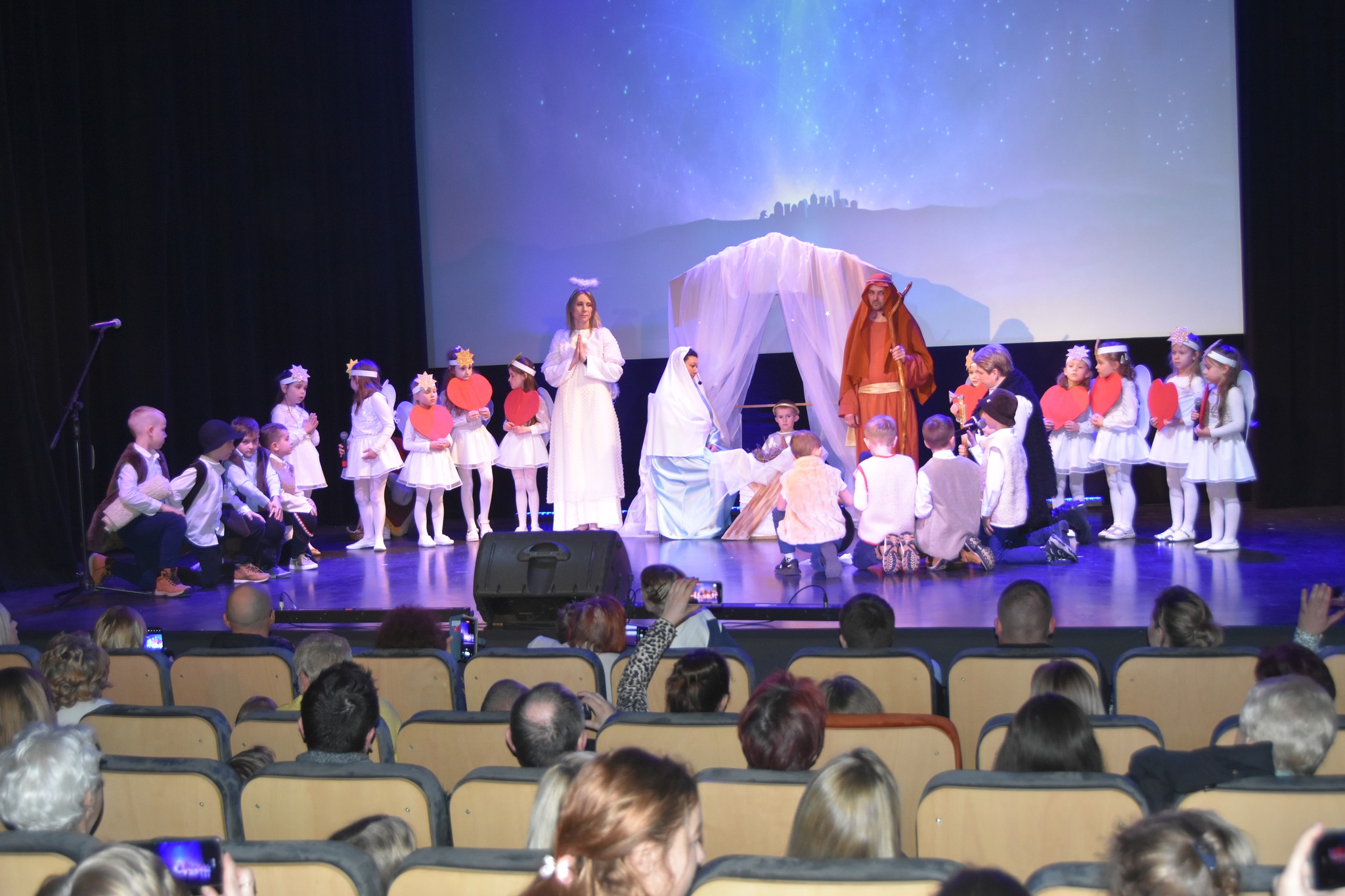 Na scenie pojawiło się czterdziestu aktorów. Było to ogromne przedsięwzięcie, które wyreżyserowała pani Teresa Nogaj – nauczycielka przedszkola. Jednocześnie zadbała o właściwą i niezwykle efektowną scenografię. Przygotowania trwały długo i została w nie zaangażowana cała ,, przedszkolna rodzina’’. Historia Bożego Narodzenia została przedstawiona w pięciu scenach, w sposób ciekawy, barwny, opisowy, niekiedy humorystyczny, ale z zachowaniem przesłania miłości oraz właściwej powagi. Całość była przemyślana, słowo mówione, pieśni i tańce tworzyły piękny obraz, a przerwy między scenami umilały kolędy. Aktorzy znakomicie odegrali swoje role, dobrze czuli się na scenie, co zauważyła publiczność i nagrodziła spektakl głośnymi brawami oraz gratulacjami. Niedzielne spotkanie zakończyła pani Anna Szajnowska- Jajko – dyrektor przedszkola, która pogratulowała wszystkim udanego, efektownego występu i podziękowała za jego przygotowanie. Jednocześnie wyraziła ogromną radość z tak miłego odbioru i przyjęcia ,,Jasełek’’ przez publiczność.