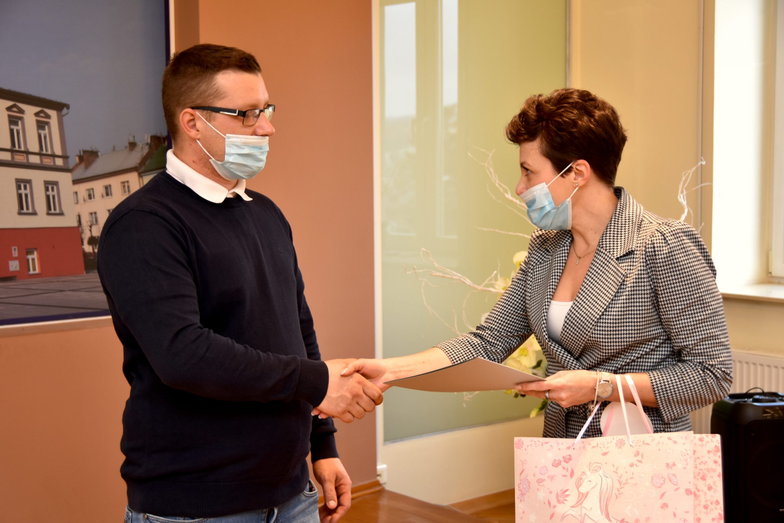Pani Urszula Dąbrowska-Huber Kierownik USC w Brzozowie oraz Pani Agnieszka Wilk Naczelnik Wydziału Spraw Obywatelskich, w imieniu Burmistrza Brzozowa Szymona Stapińskiego, przekazały na ręce szczęśliwego taty, gratulacje i życzenia zdrowia dla pociechy i rodziców oraz wielu szczęśliwych chwil w nowym roku, który tak pięknie rozpoczął się dla młodego małżeństwa.