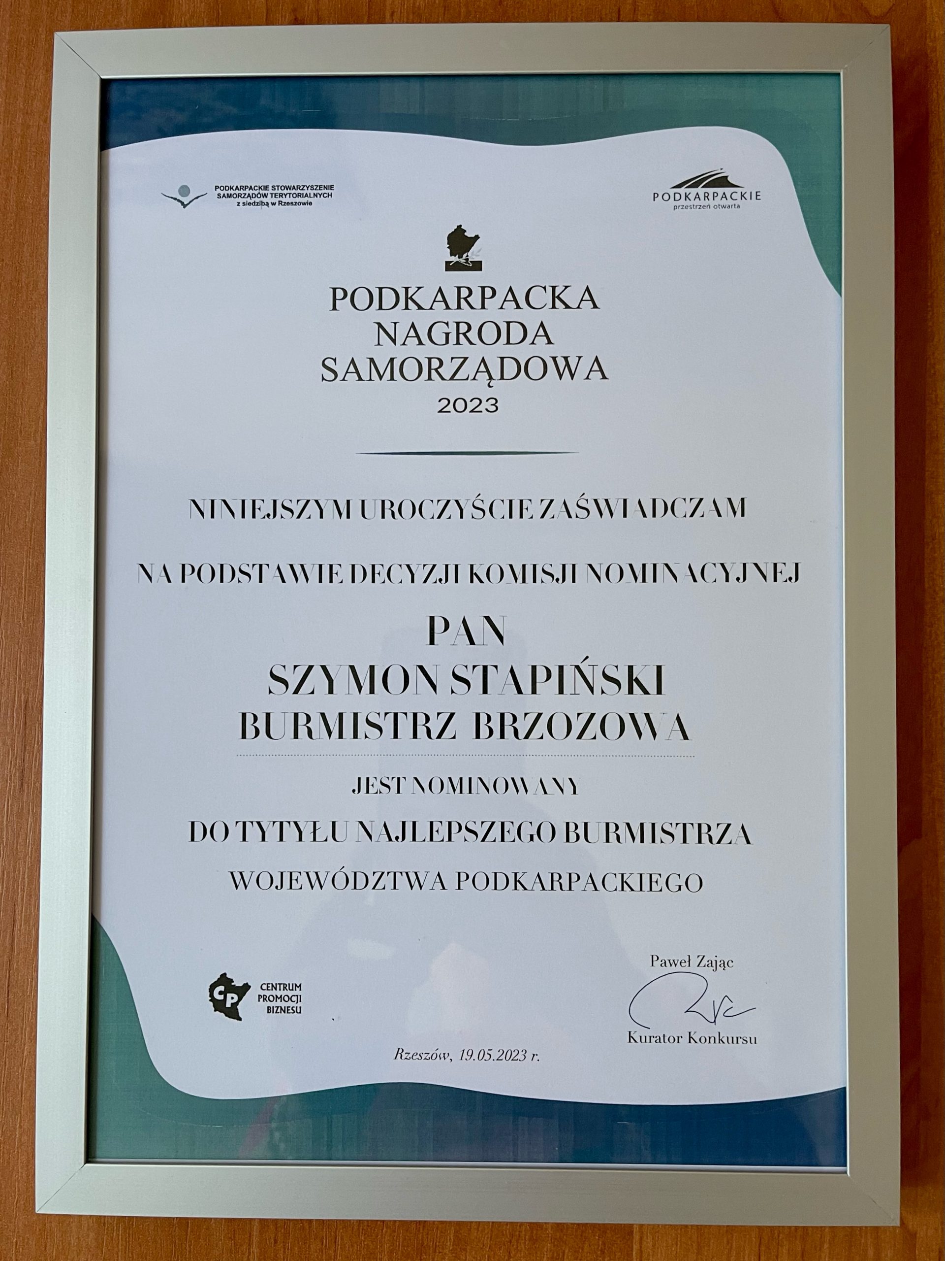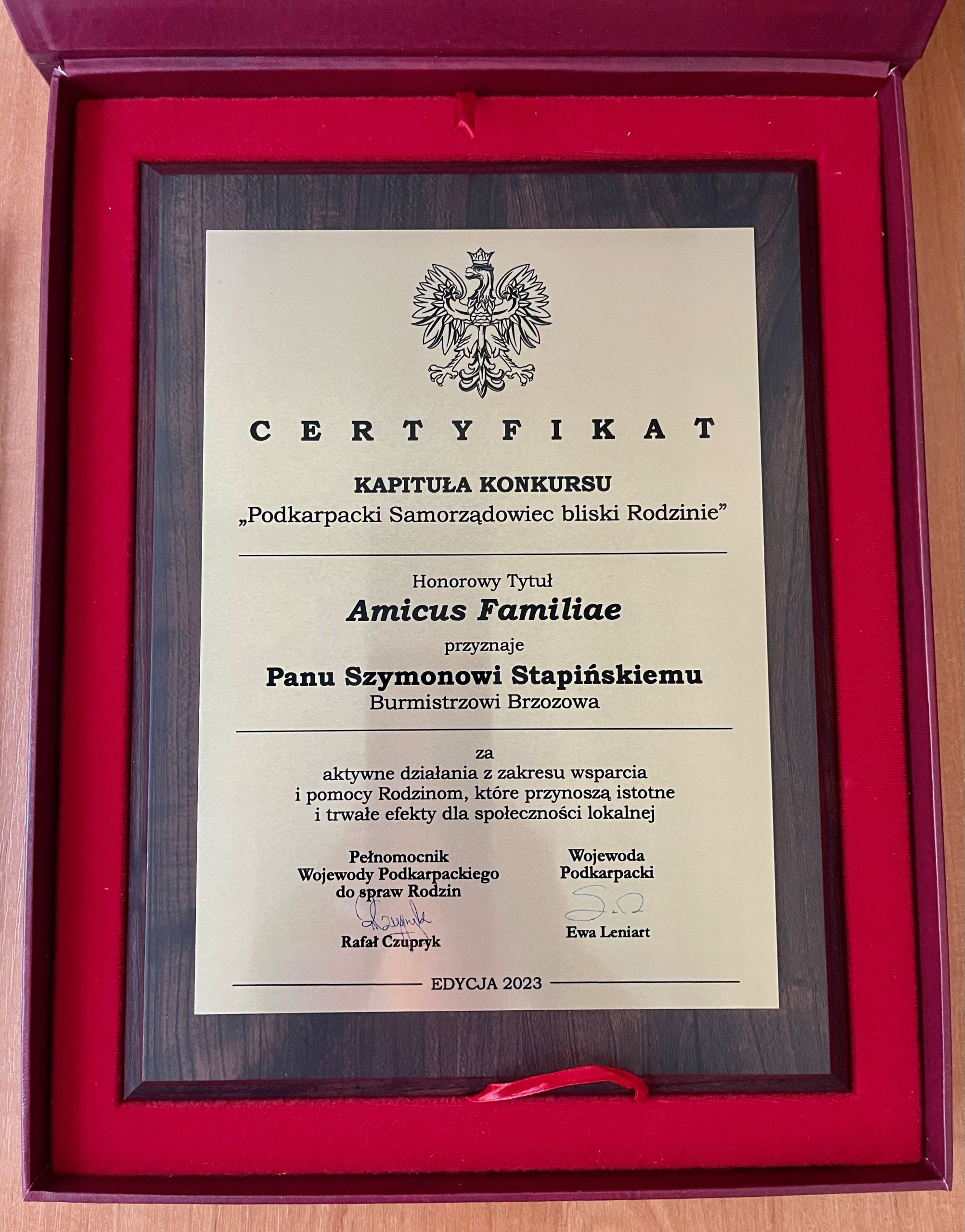 Honorowy certyfikat w podziękowaniu za aktywne działania z zakresu wsparcia i pomocy rodzinom, które przynoszą istotne i trwałe efekty dla społeczności lokalnej wręczyli Wojewoda Podkarpacki Ewa Leniart wraz z pełnomocnikiem ds. rodzin Rafałem Czuprykiem. Burmistrz Brzozowa Szymon Stapiński znalazł się w gronie 3 laureatów, obok starosty powiatu ropczycko-sędziszowskiego oraz wójta gminy Tryńcza.