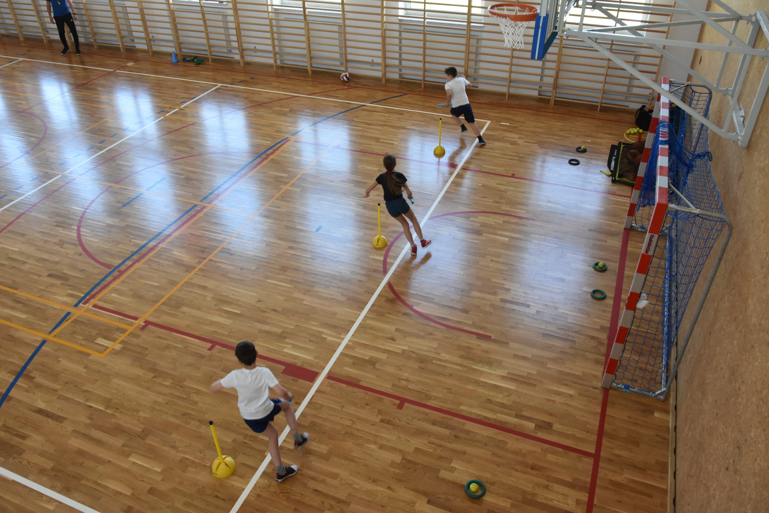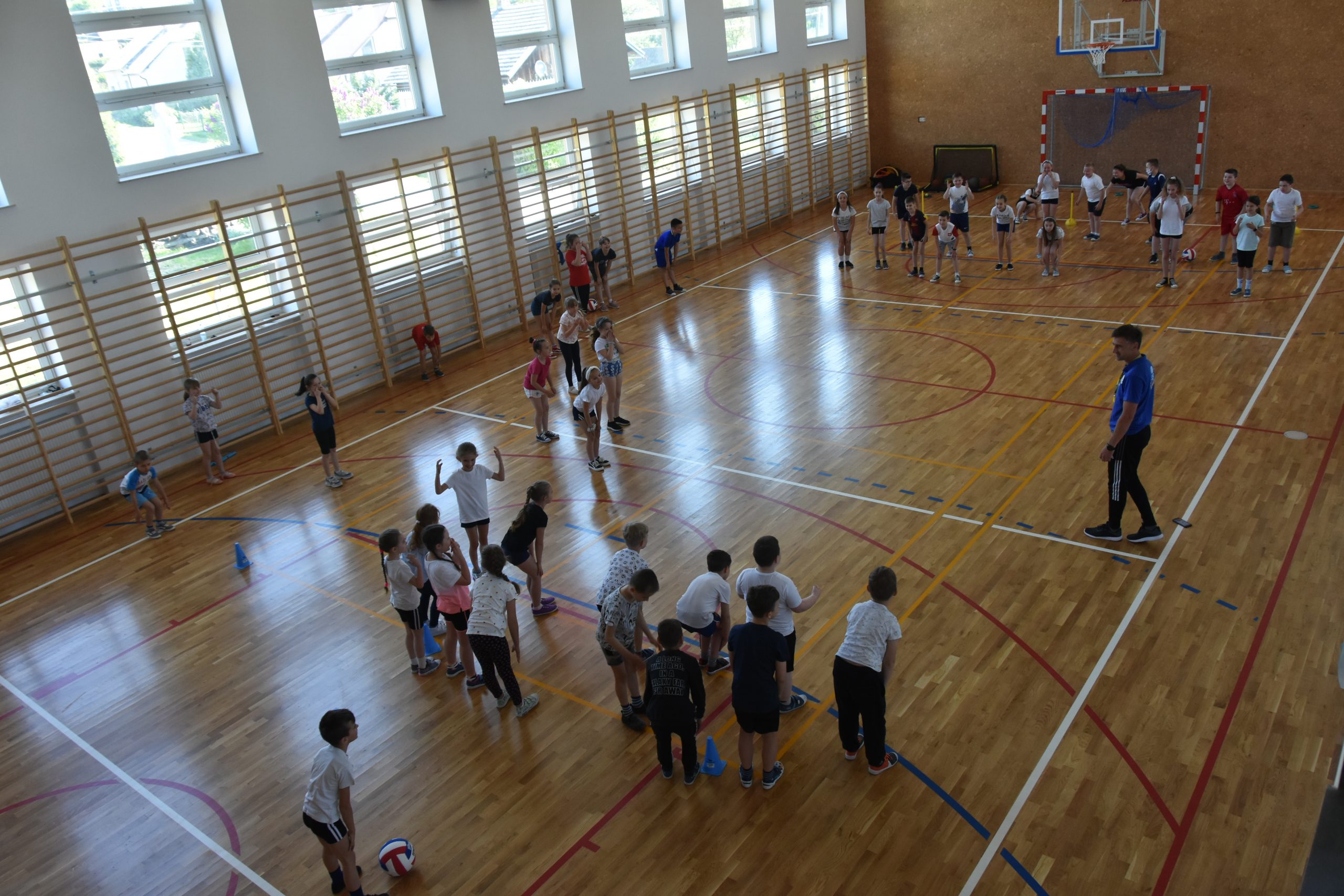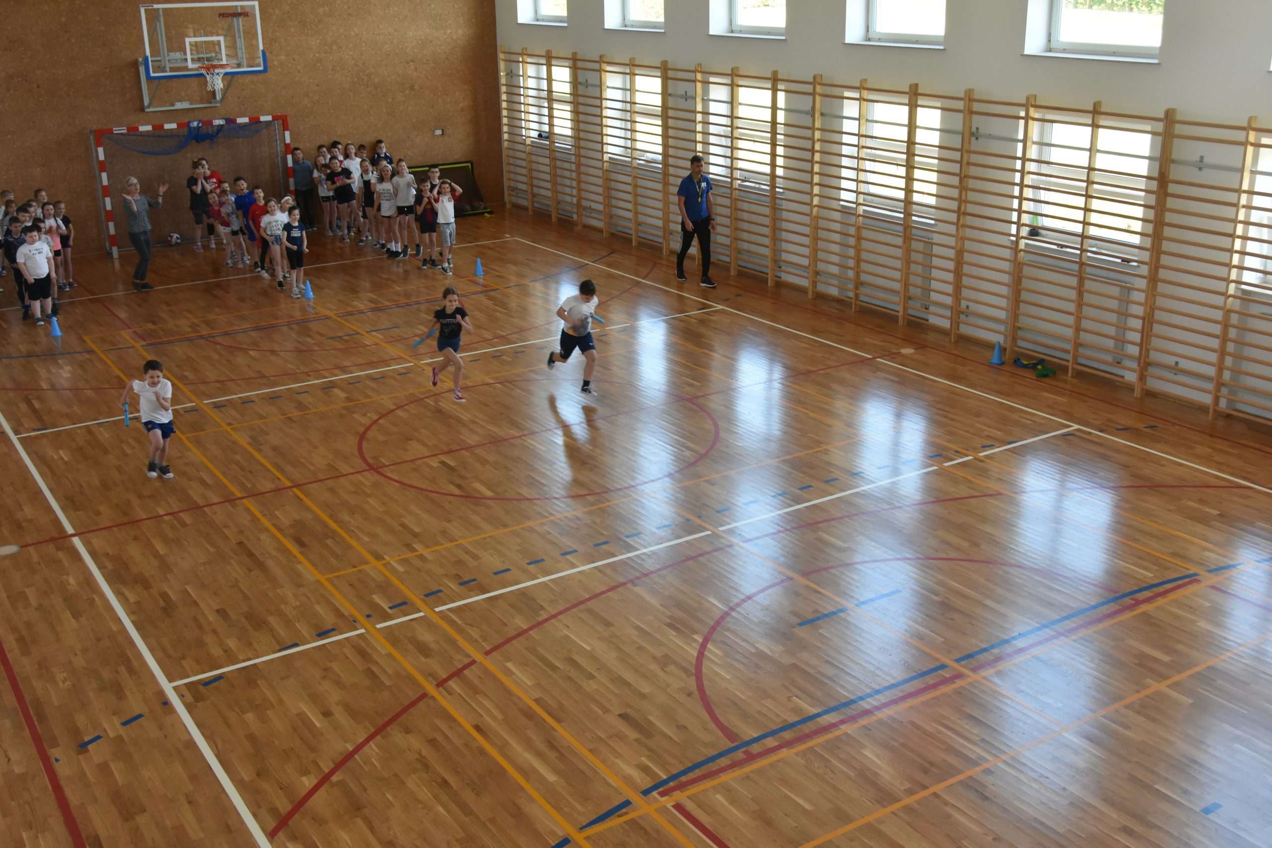 W sali gimnastycznej na młodsze dzieci czekały konkurencje sprawnościowe, za wykonanie których uczniowie zbierali punkty. Milusińscy z ogromnym zapałem brali udział w wyścigach i grach zespołowych. Humory dopisywały, radości z aktywności fizycznej nie było końca. Ponadto w tym dniu odbył się też charytatywny kiermasz dla Kubusia Zwierzchowskiego. Cały dochód ze sprzedaży przygotowanych ciast, słodkości zostanie przeznaczony na jego leczenie.