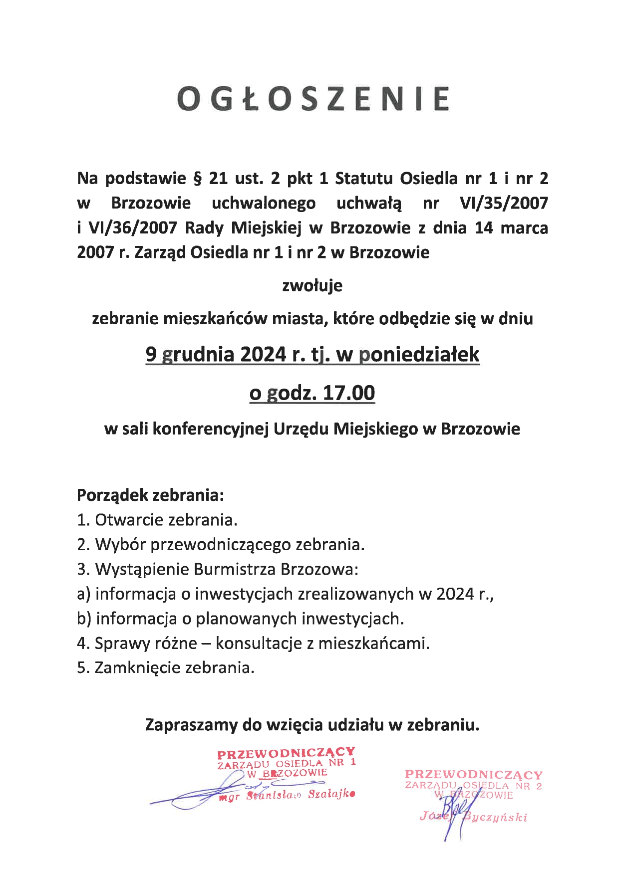 Zarząd Osiedla Nr 1 i Nr 2 2 Brzozowie zwołuje zebranie mieszkańców miasta, które odbędzie się w dniu 9 grudnia 2024 r. tj. poniedziałek o godz. 17:00 w sali konferencyjnej Urzędu Miejskiego w Brzozowie. Program w rozwinięciu.