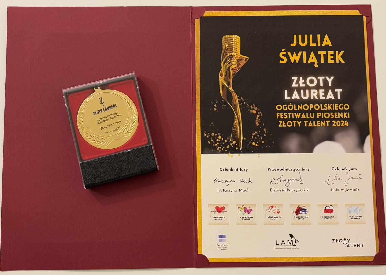 11 stycznia br. w Pałacu Czartoryskich w Lublinie odbył się finał edycji Ogólnopolskiego Festiwalu Piosenki Złoty Talent 2024. W konkursie wzięło udział 32 uczestników wyłonionych z pięciu różnych kategorii laureatów Pierwszych Nagród. Wśród finalistów znalazły się również mieszkanki naszej gminy: Nikola Pytlak, Amelia Sowińska i Julia Świątek.