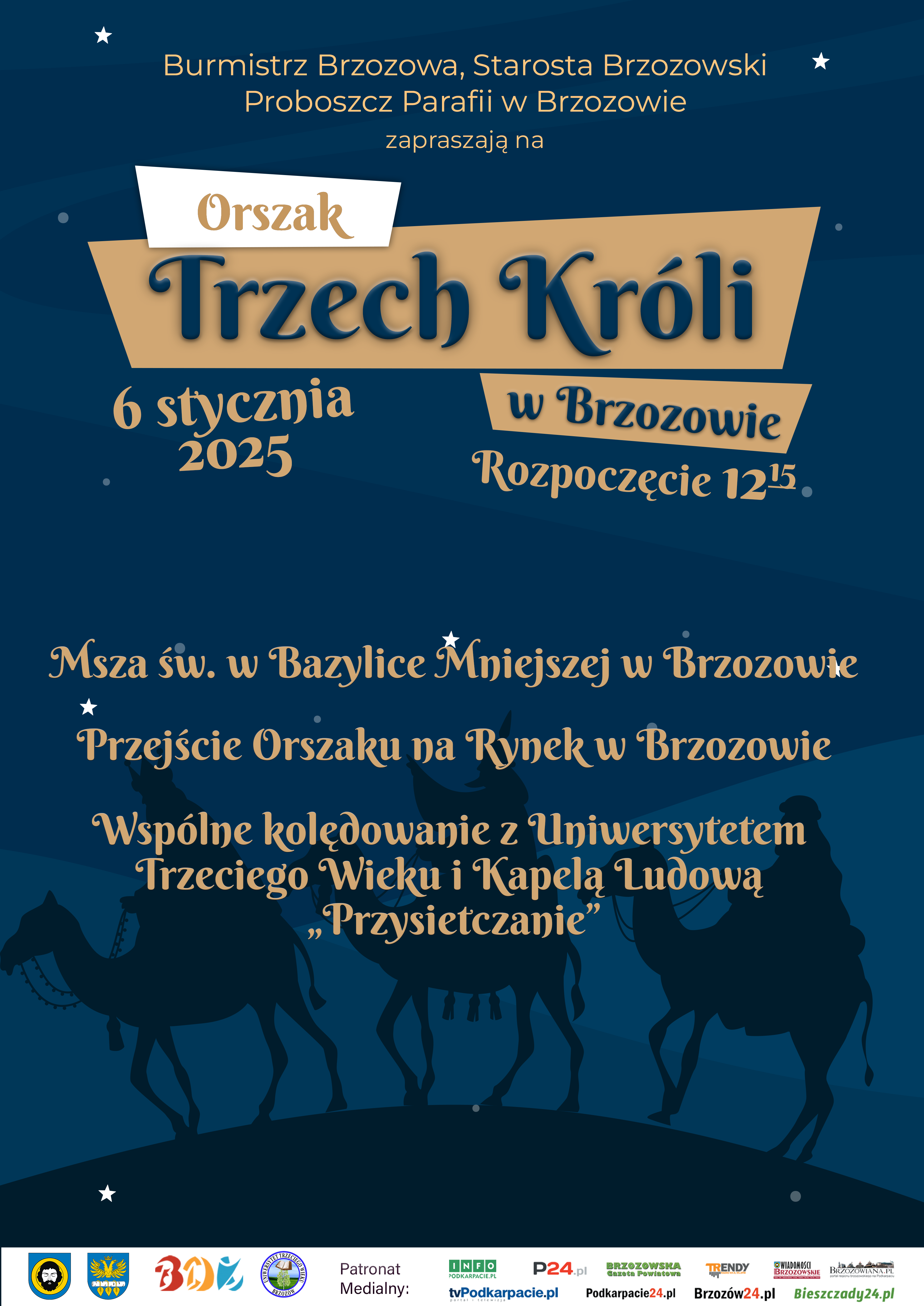 Orszak Trzech Króli już po raz trzeci w Brzozowie. Zapraszamy do wspólnego świętowania w poniedziałek 𝟲 𝘀𝘁𝘆𝗰𝘇𝗻𝗶𝗮. Uroczystość rozpoczniemy o godz. 12:15 mszą św. w Bazylice Mniejszej w Brzozowie. Po jej zakończeniu nastąpi formowanie się orszaku, który przejdzie na Rynek.
