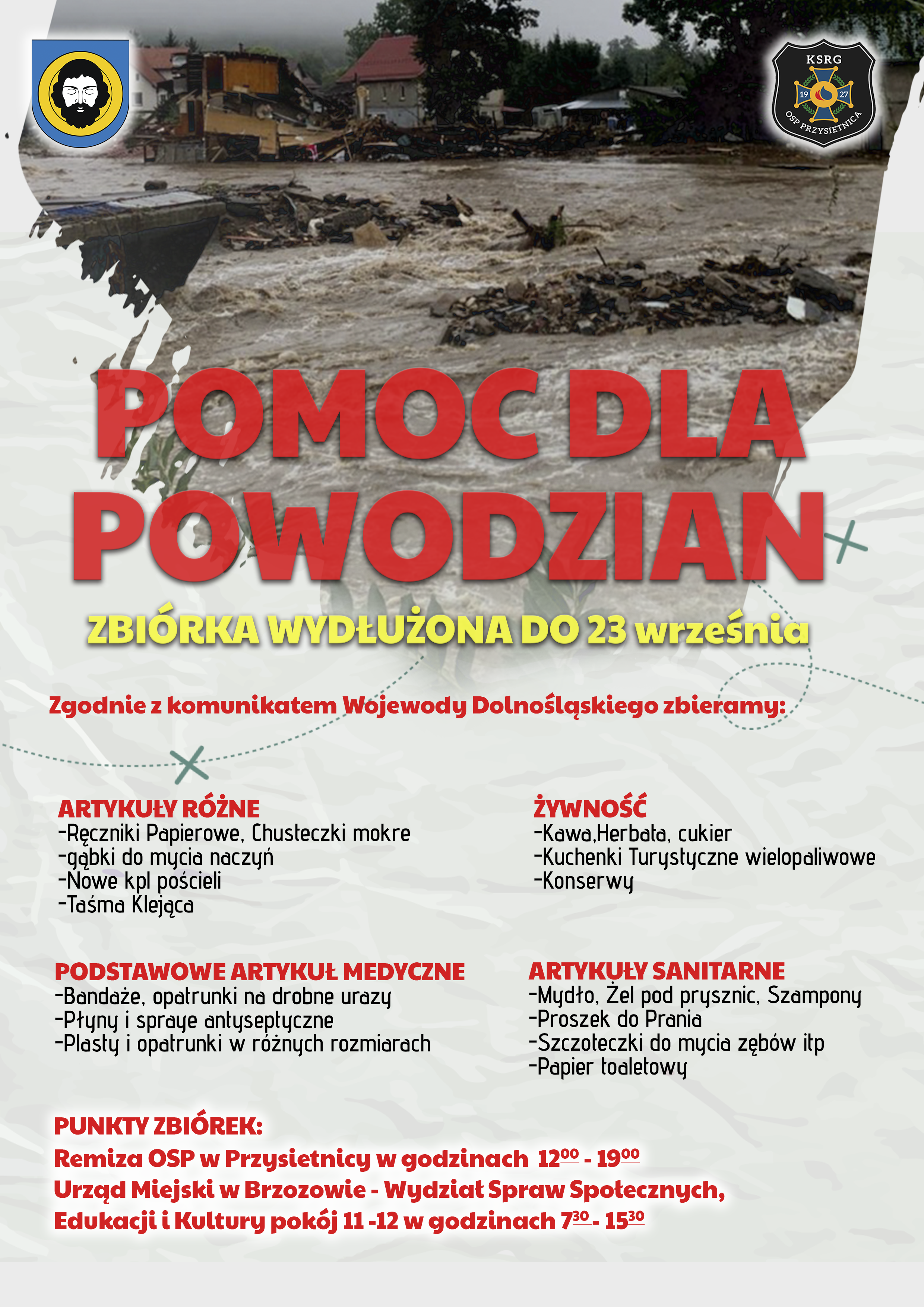 Gmina Brzozów z inicjatywy Ochotniczej Straży Pożarnej w Przysietnicy zbierają dary dla powodzian 𝐝𝐨 𝐧𝐚𝐣𝐛𝐥𝐢ż𝐬𝐳𝐞𝐠𝐨 𝐜𝐳𝐰𝐚𝐫𝐭𝐤𝐮 𝟏𝟗 𝐰𝐫𝐳𝐞ś𝐧𝐢𝐚 𝐛𝐫. w dwóch głównych punktach: