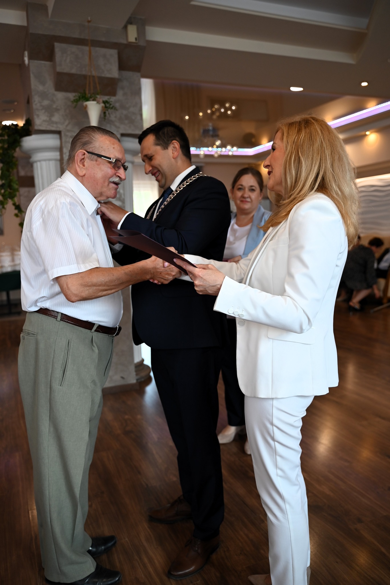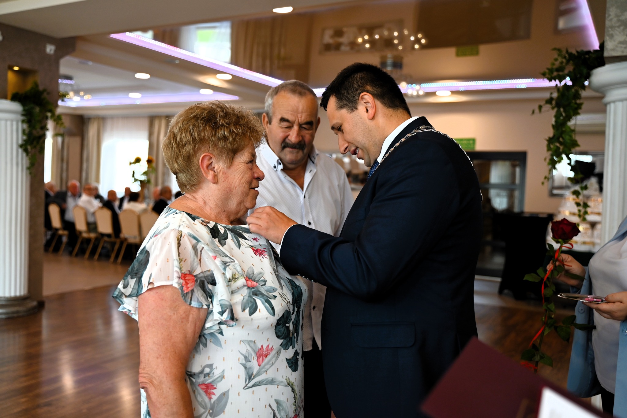 Z rąk Burmistrza Brzozowa Szymona Stapińskiego oraz Przewodniczącej Rady Miejskiej Doroty Kamińskiej pary odebrały Medale za Długoletnie Pożycie Małżeńskie, przyznane przez Prezydenta RP. Nie zabrakło także pamiątkowych dyplomów, legitymacji oraz drobnych upominków. Oficjalną część uroczystości poprowadziła kierownik Urzędu Stanu Cywilnego w Brzozowie Urszula Dąbrowska-Huber. Następnie przyszedł czas na wzruszenia – tradycyjne „Sto lat”, toast lampką szampana oraz… pierwszy taniec, jak sprzed 50 lat!  Uroczystość uświetnił także pokaz tańca w wykonaniu artystów z grupy tanecznej „Gracja” z Krosna, który zachwycił wszystkich gości i wprowadził wyjątkowy klimat elegancji i radości. W wydarzeniu udział wzięli również Sekretarz Gminy Brzozów Waldemar Och oraz Naczelnik Wydziału Spraw Społecznych, Edukacji i Kultury UM w Brzozowie Nina Ścibor.