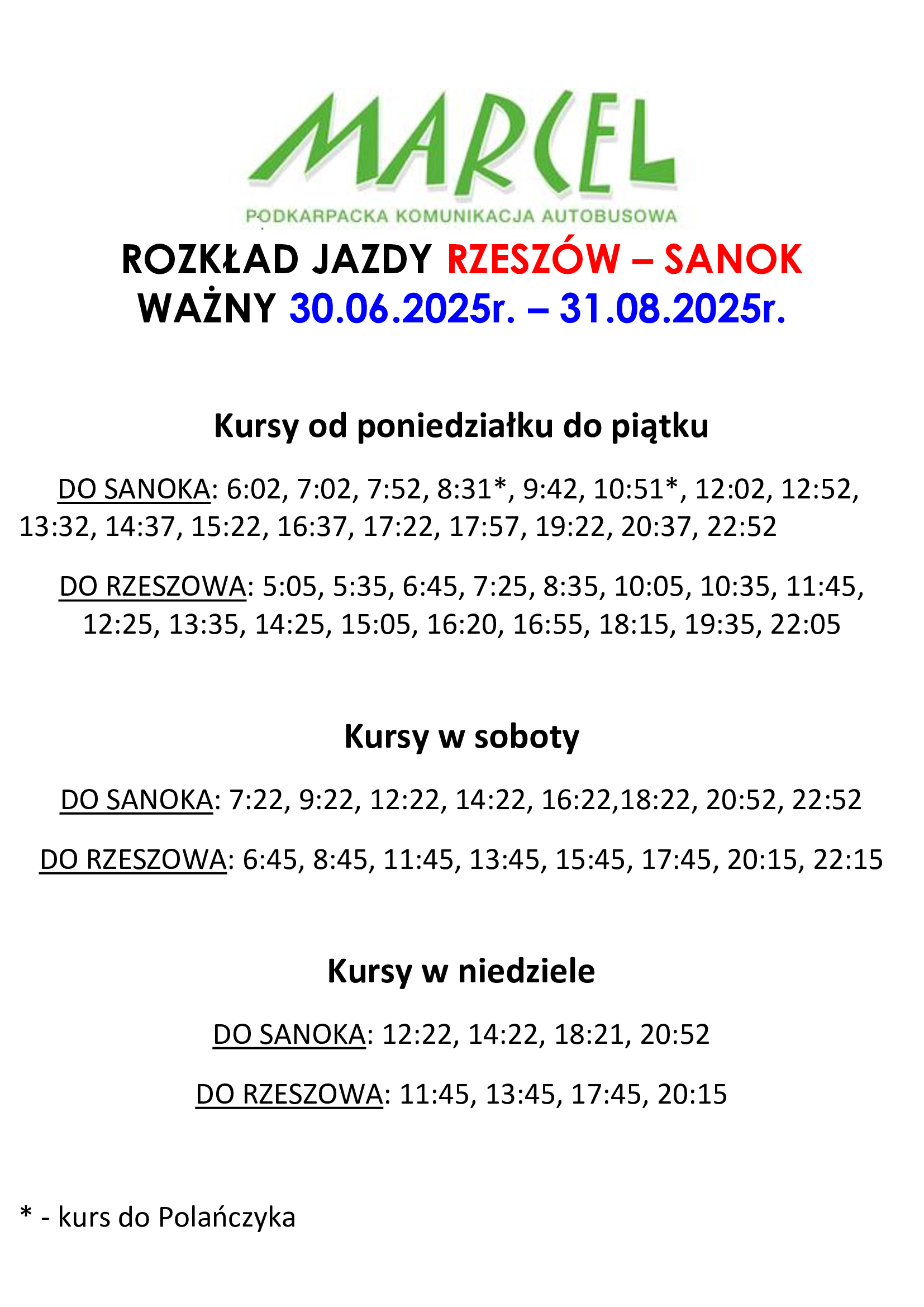 03.07.2025 Rozkład jazdy busów Marcel na wakacje Rozkład jazdy busów Marcel na wakacje ważny w dniach 30.06.2025 r.- 31.08.2025 r.