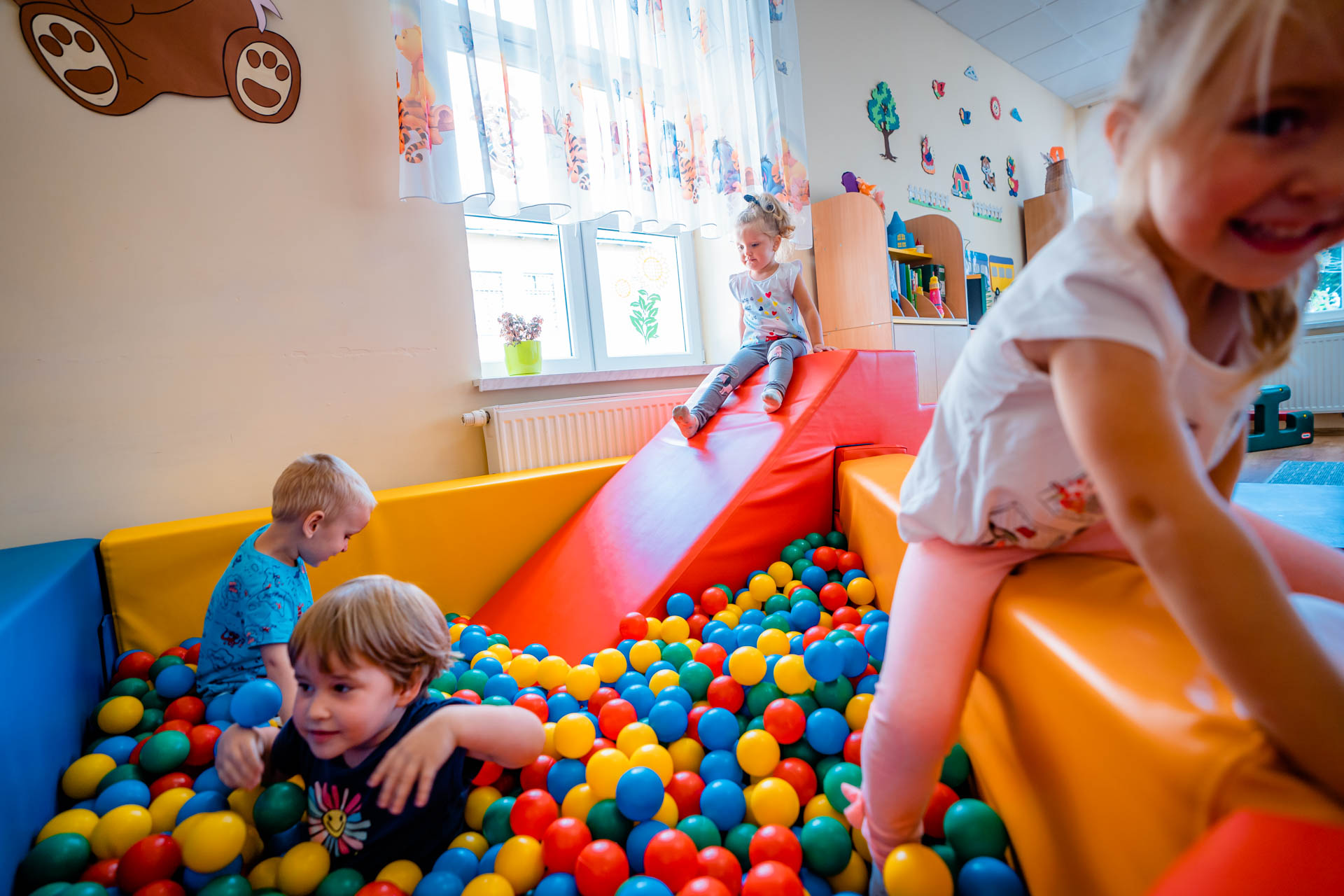 Wyróżniają nas piękne kolorowe sale, pomieszczenie do zabaw KORFIK, oraz sala widowiskowo-teatralna.