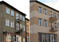 Czterokondygnacyjny budynek urzędu z jasną elewacją. Przed budynkiem popiersie i drzewa