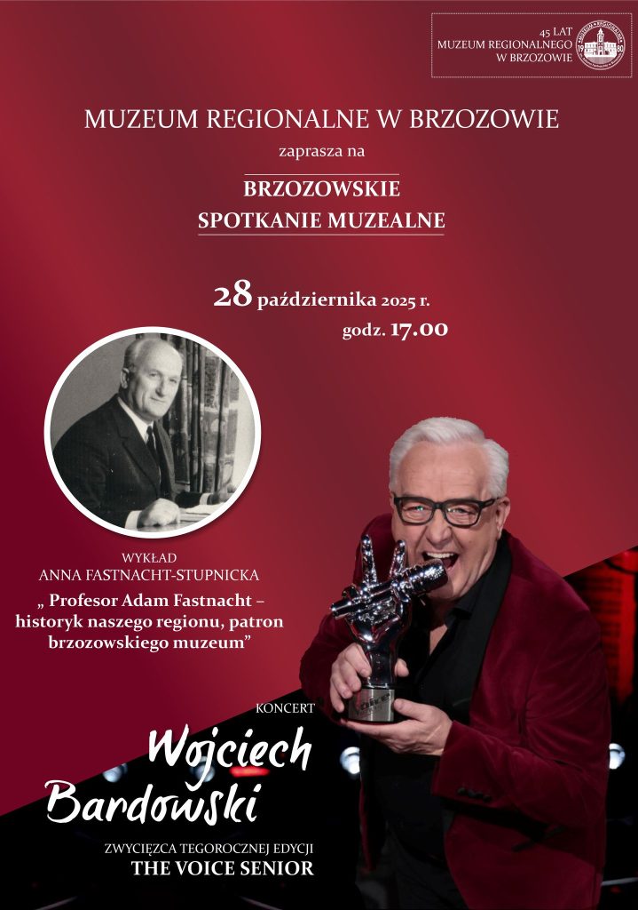 20.10.2025 Brzozowskie Spotkanie Muzealne Muzeum Regionalne im. Adama Fastnachta w Brzozowie zaprasza na Brzozowskie Spotkanie Muzealne! 28 października, godz. 17:00 – wykład Anny Fastnacht-Stupnickiej i koncert Wojciecha Bardowskiego, zwycięzcy The Voice Senior.