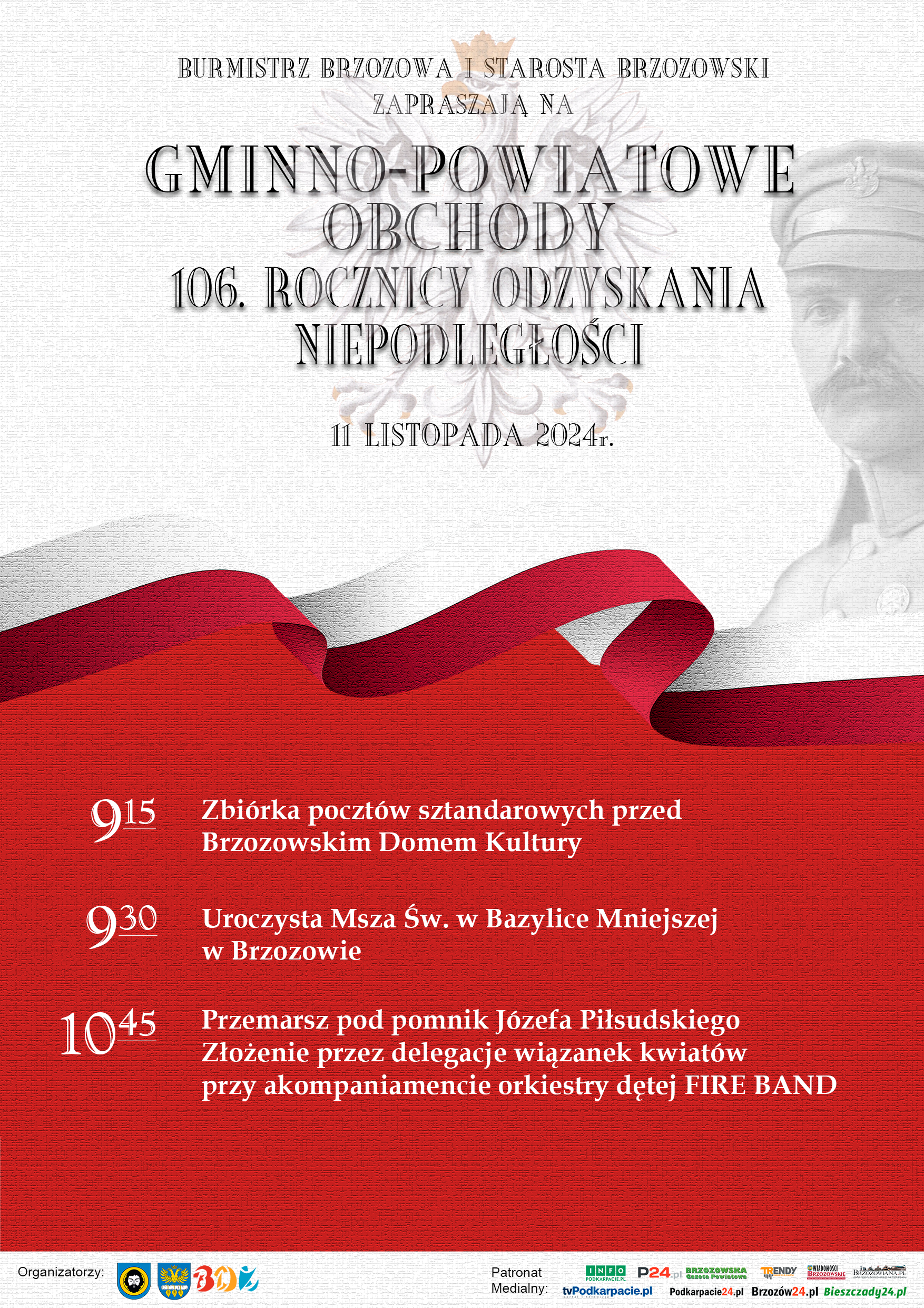Burmistrz Brzozowa i Starosta Brzozowski serdecznie zapraszają wszystkich mieszkańców i gości na Gminno – Powiatowe Obchody 106. Rocznicy Odzyskania Niepodległości.