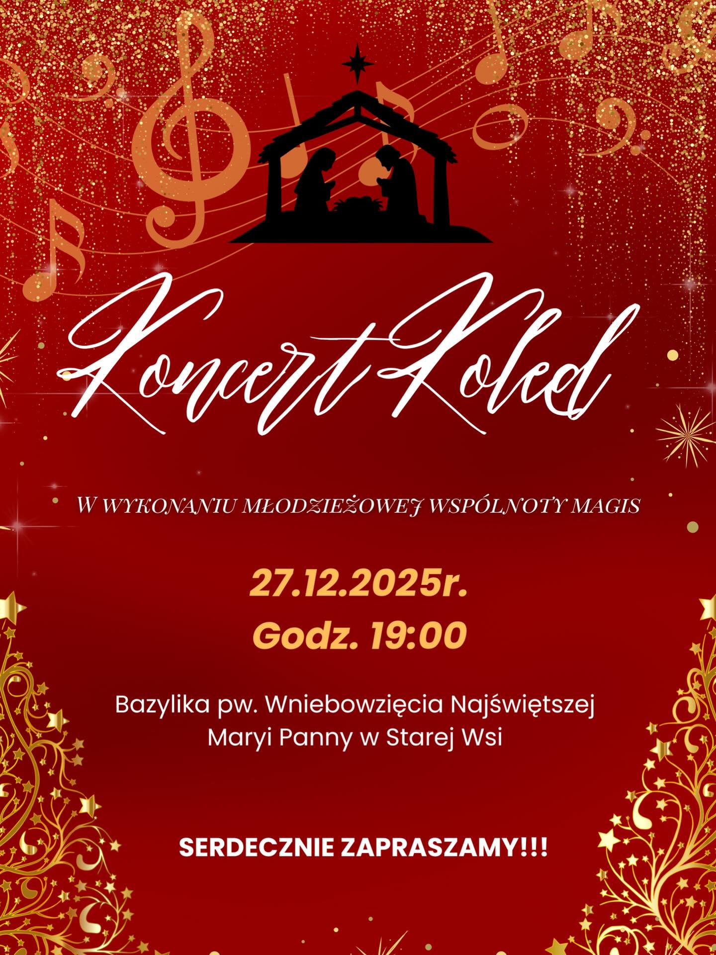 W sobotę, 27 grudnia o godz. 19:00 w Bazylika WNMP w Starej Wsi odbędzie się piękny koncert kolęd w wykonaniu młodzieży Wspólnoty Magis Stara Wieś. To czas, by zatrzymać się w świątecznej atmosferze, wsłuchać w tradycyjne melodie i pozwolić, by muzyka wprowadziła nas w głębię Bożonarodzeniowej radości. W imieniu organizatorów, serdecznie zapraszamy wszystkich — niech to będzie wieczór pełen pokoju, światła i wspólnego kolędowania.