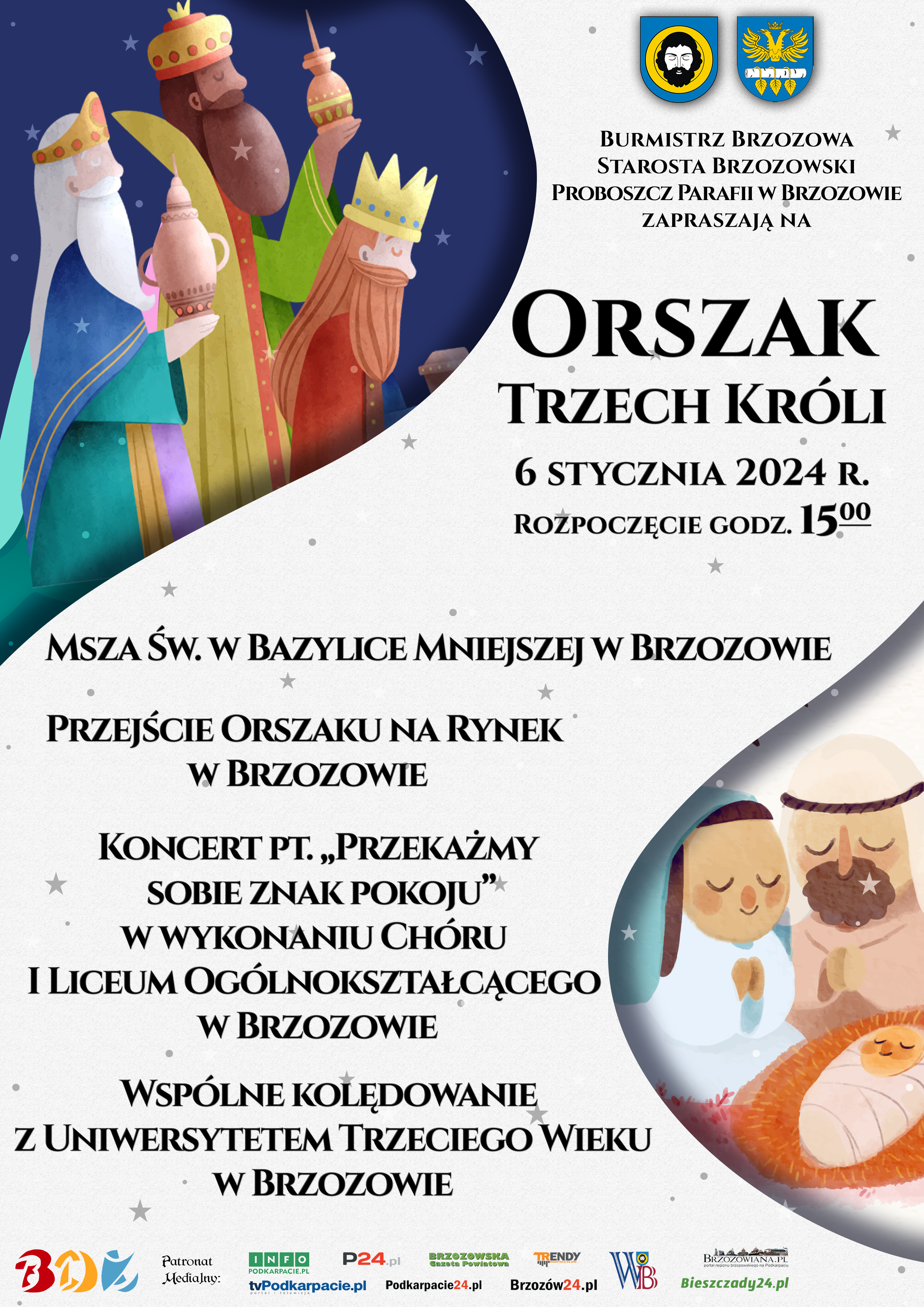 Serdecznie zapraszamy mieszkańców naszej gminy do wzięcia udziału w Orszaku Trzech Króli 6 stycznia 2024 r. Uroczystość rozpoczniemy o godz. 15:00 mszą św. w Bazylice Mniejszej w Brzozowie. Po jej zakończeniu nastąpi formowanie się orszaku, który przejdzie na Rynek.