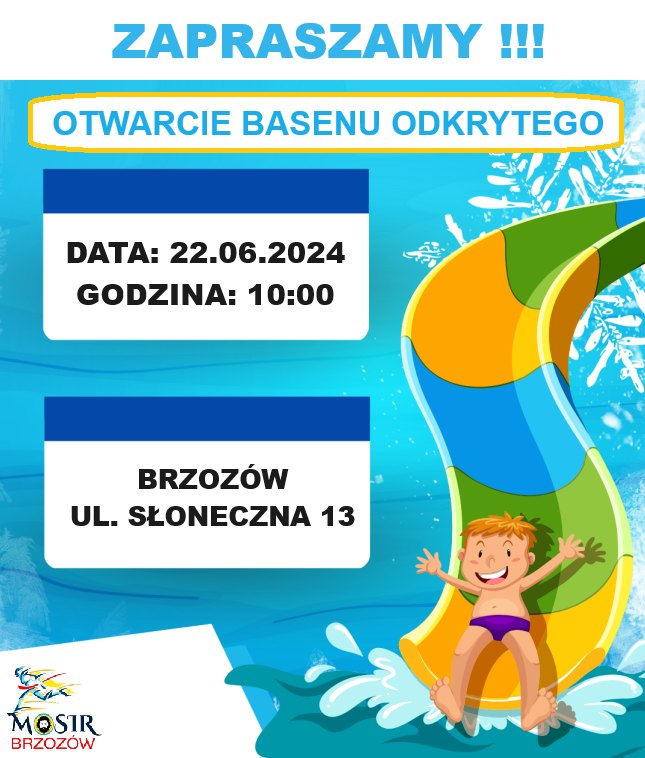 Otwieramy sezon na „Słonecznej” . Już w najbliższą sobotę 22 czerwca br. o godz. 10:00 zapraszamy wszystkich miłośników pływania i relaksu na świeżym powietrzu na otwarcie basenu odkrytego – Brzozów, ul. Słoneczna.