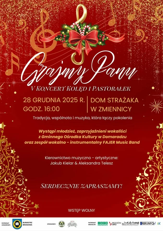 W imieniu organizatorów, serdecznie zapraszamy na V Koncert Kolęd i Pastorałek „Grajmy Panu”, który odbędzie się 28 grudnia br. o godz. 16:00 w Domu Strażaka w Zmiennicy. Patronat nad wydarzeniem objął Burmistrz Brzozowa. To wyjątkowa okazja do wspólnego kolędowania i świątecznego spotkania w gronie mieszkańców i gości. Szczegóły na plakacie.
