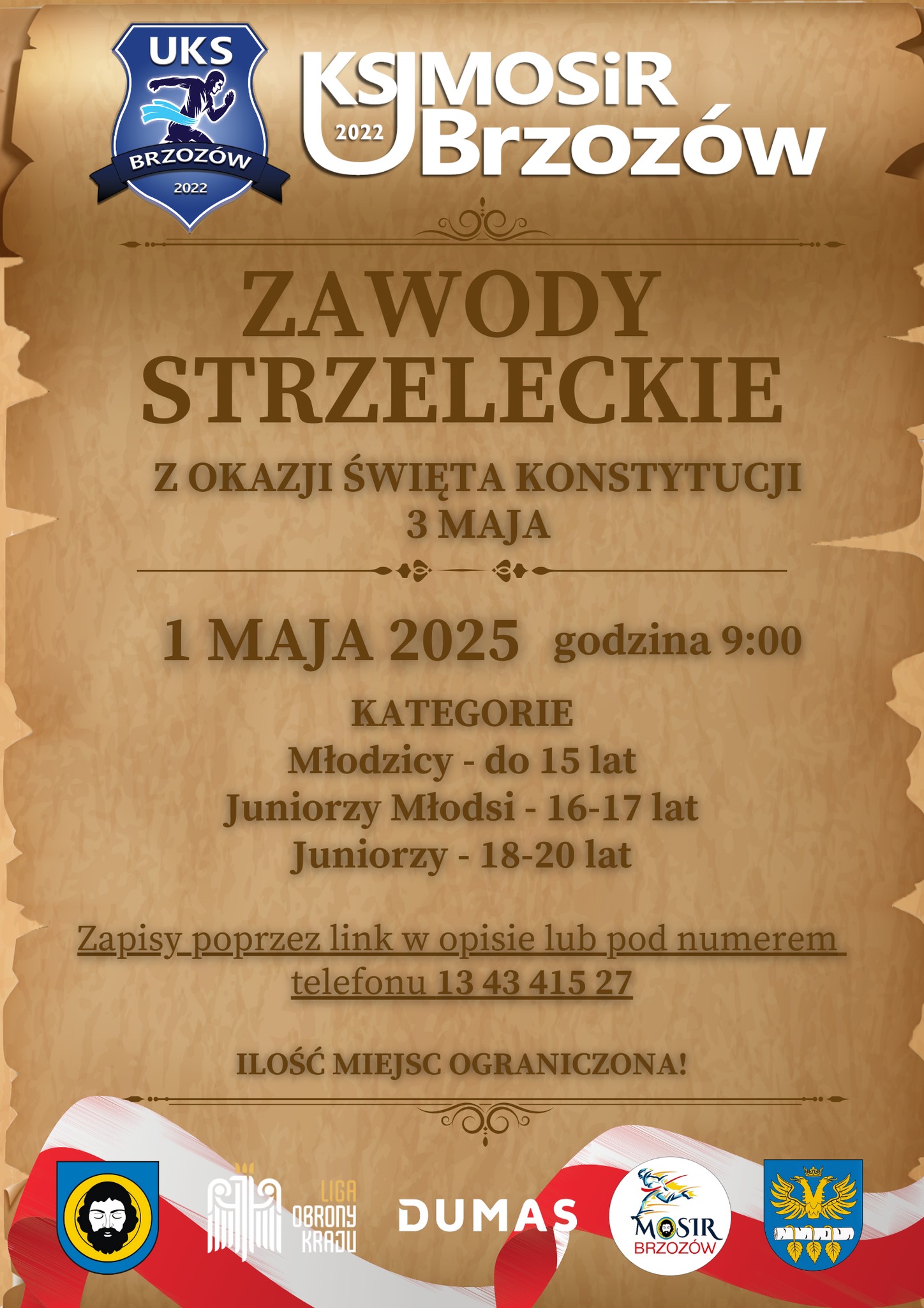 Serdecznie zapraszamy na zawody z okazji Święta Konstytucji 3 Maja. Wydarzenie odbędzie się 1 maja (czwartek) o godz. 9:00 w Strzelnicy sportowej LOK w Brzozowie.