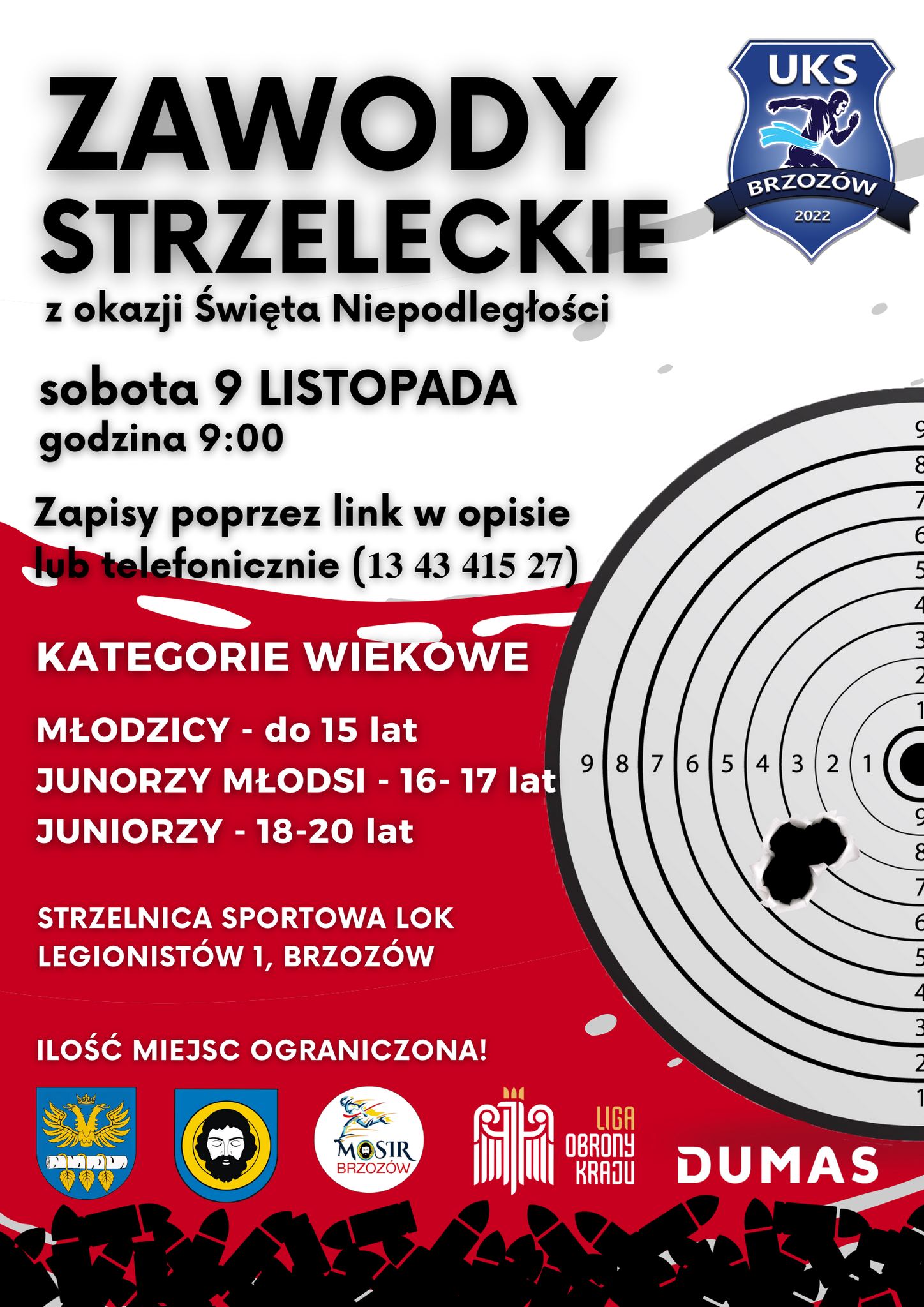 Uczniowski Klub Sportowy MOSiR Brzozów zaprasza 9 listopada br. o godz. 9:00 na Zawody Strzeleckie na Strzelnicę sportową LOK, ul. Legionistów 1, Brzozów.