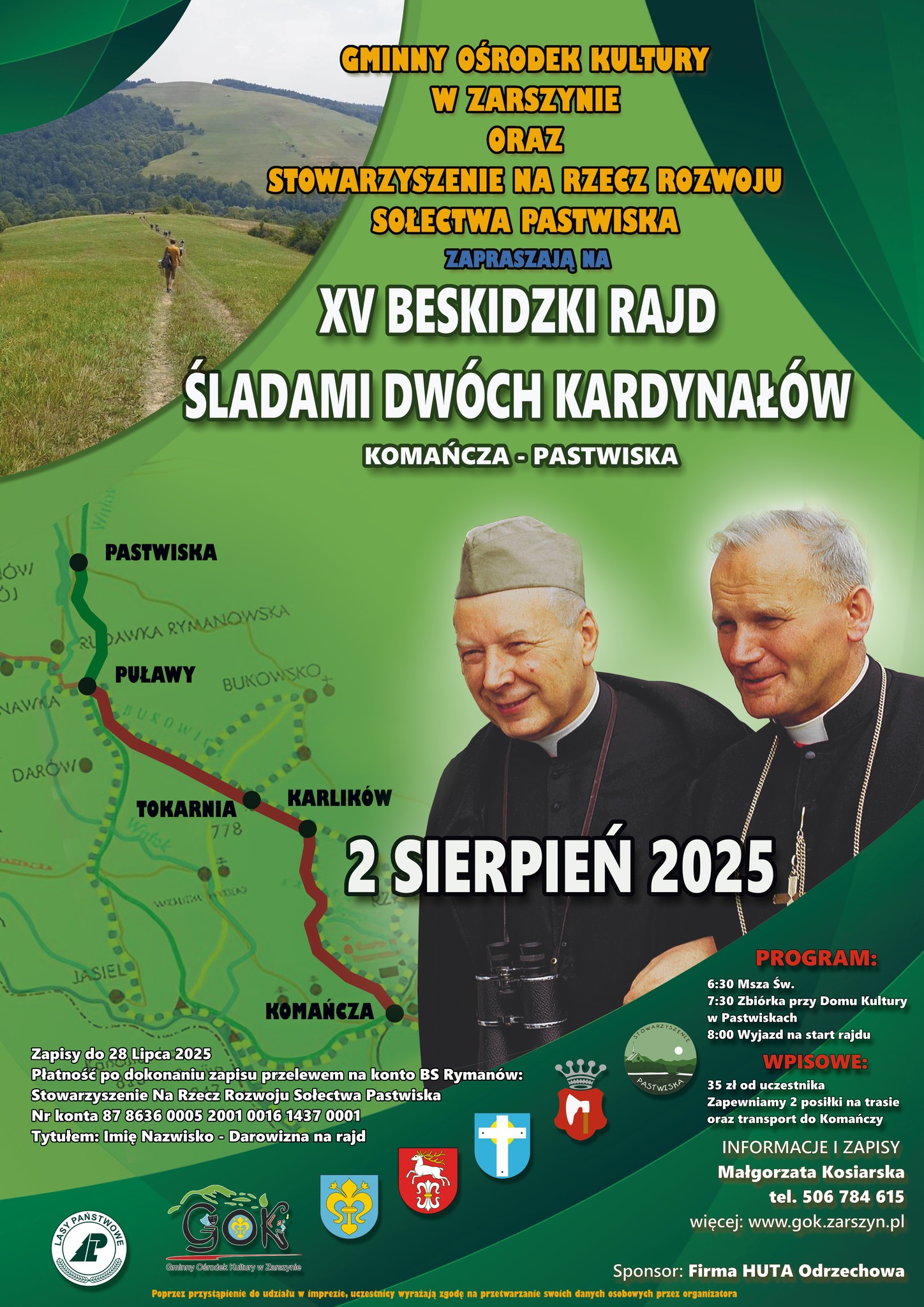 GOK w Zarszynie oraz Stowarzyszenie na Rzecz Rozwoju Sołectwa Pastwiska zapraszają na Beskidzki Rajd Śladami Dwóch Kardynałów, który odbędzie się w dniu 2 sierpnia 2025 roku. To niepowtarzalna okazja, aby aktywnie spędzić czas w pięknych okolicznościach przyrody, podążając śladami dwóch wielkich postaci Kościoła – kard. Karola Wojtyły i kard. Stefana Wyszyńskiego – którzy wielokrotnie wędrowali tymi trasami, czerpiąc siłę z natury i wspólnoty. Szczegóły na plakacie.