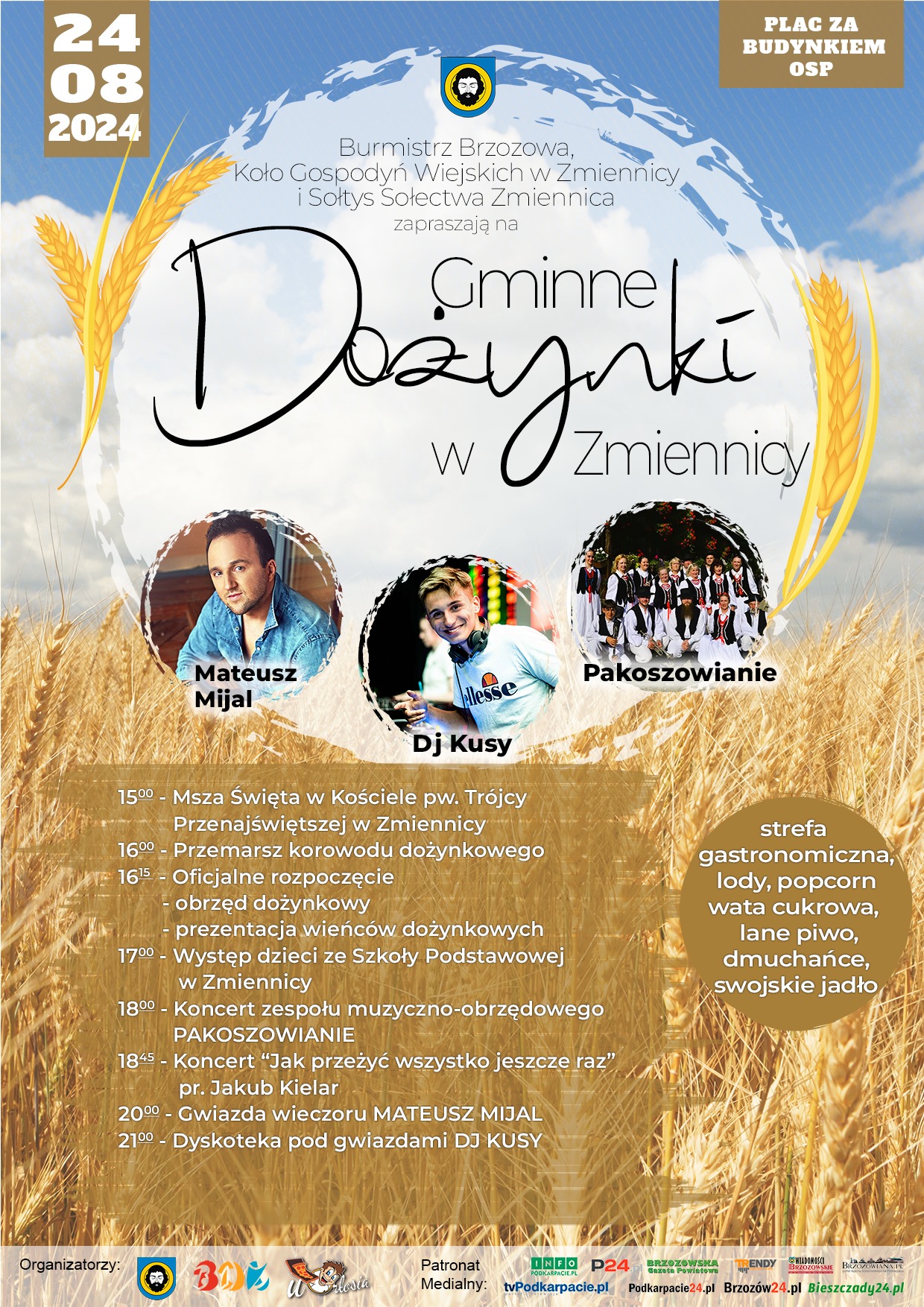 Burmistrz Brzozowa, Koło Gospodyń Wiejskich w Zmiennicy i Sołtys Sołectwa Zmiennica zapraszają na 𝙂𝙢𝙞𝙣𝙣𝙚 𝘿𝙤𝙯̇𝙮𝙣𝙠𝙞. To nie tylko przepiękne wieńce i staropolskie zwyczaje. To moc atrakcji dla każdego. Szczegóły na plakacie.