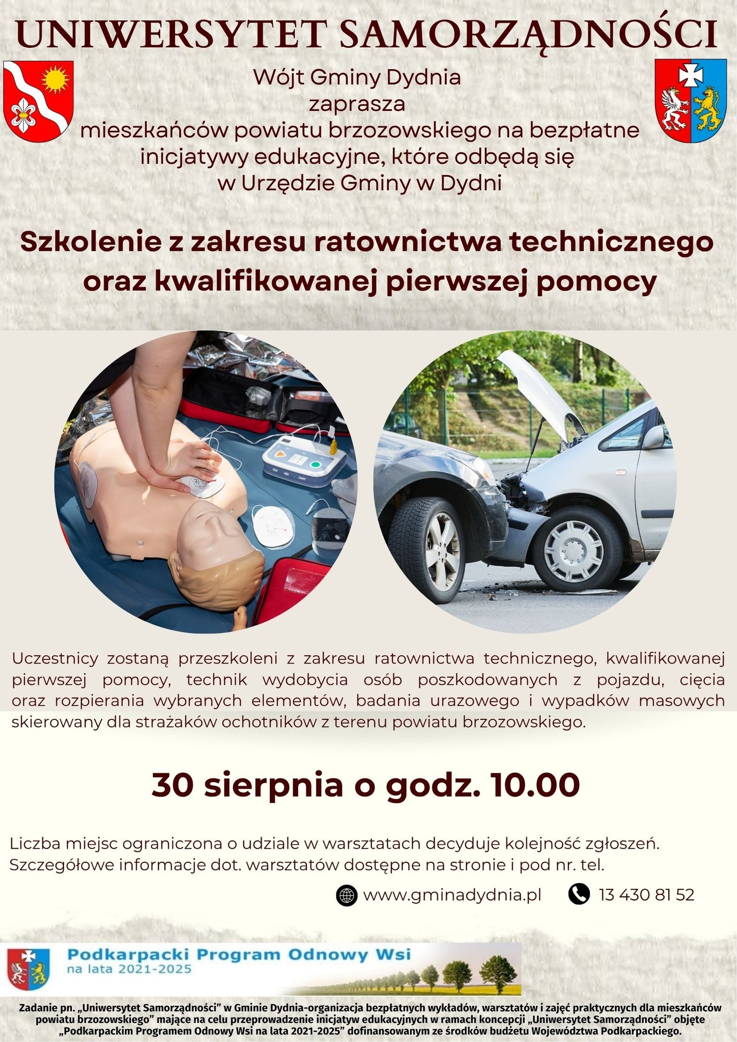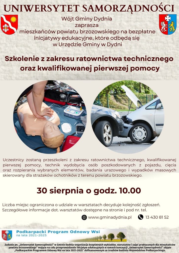 Wójt Gminy Dydnia zaprasza na kolejne wartościowe warsztaty w ramach realizowanego przez Gminę Dydnia zadania pn.: „Uniwersytet Samorządności w Gminie Dydnia – organizacja bezpłatnych wykładów, warsztatów i zajęć praktycznych dla mieszkańców powiatu brzozowskiego”. Szczegóły na plakacie.