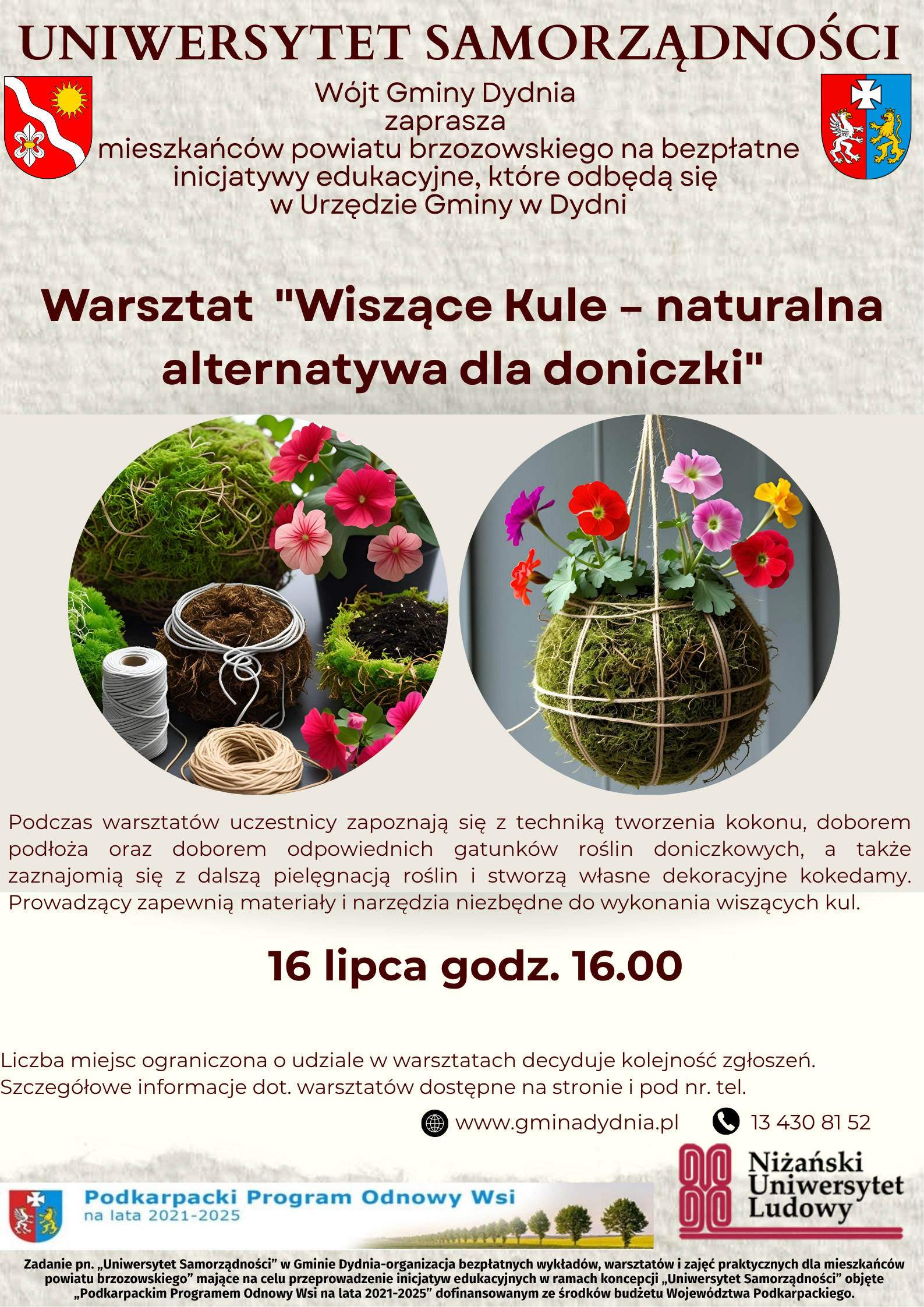 Wójt Gminy Dydnia zaprasza mieszkańców powiatu brzozowskiego na bezpłatne warsztaty w ramach „Uniwersytetu Samorządności”. Zadanie pn. „Uniwersytet Samorządności” w Gminie Dydnia – organizacja bezpłatnych wykładów, warsztatów i zajęć praktycznych dla mieszkańców powiatu brzozowskiego” mające na celu przeprowadzenie inicjatyw edukacyjnych w ramach koncepcji „Uniwersytet Samorządności” objęte „Podkarpackim Programem Odnowy Wsi na lata 2021-2025” dofinansowane ze środków budżetu województwa podkarpackiego. Szczegóły na plakatach w rozwinięciu.