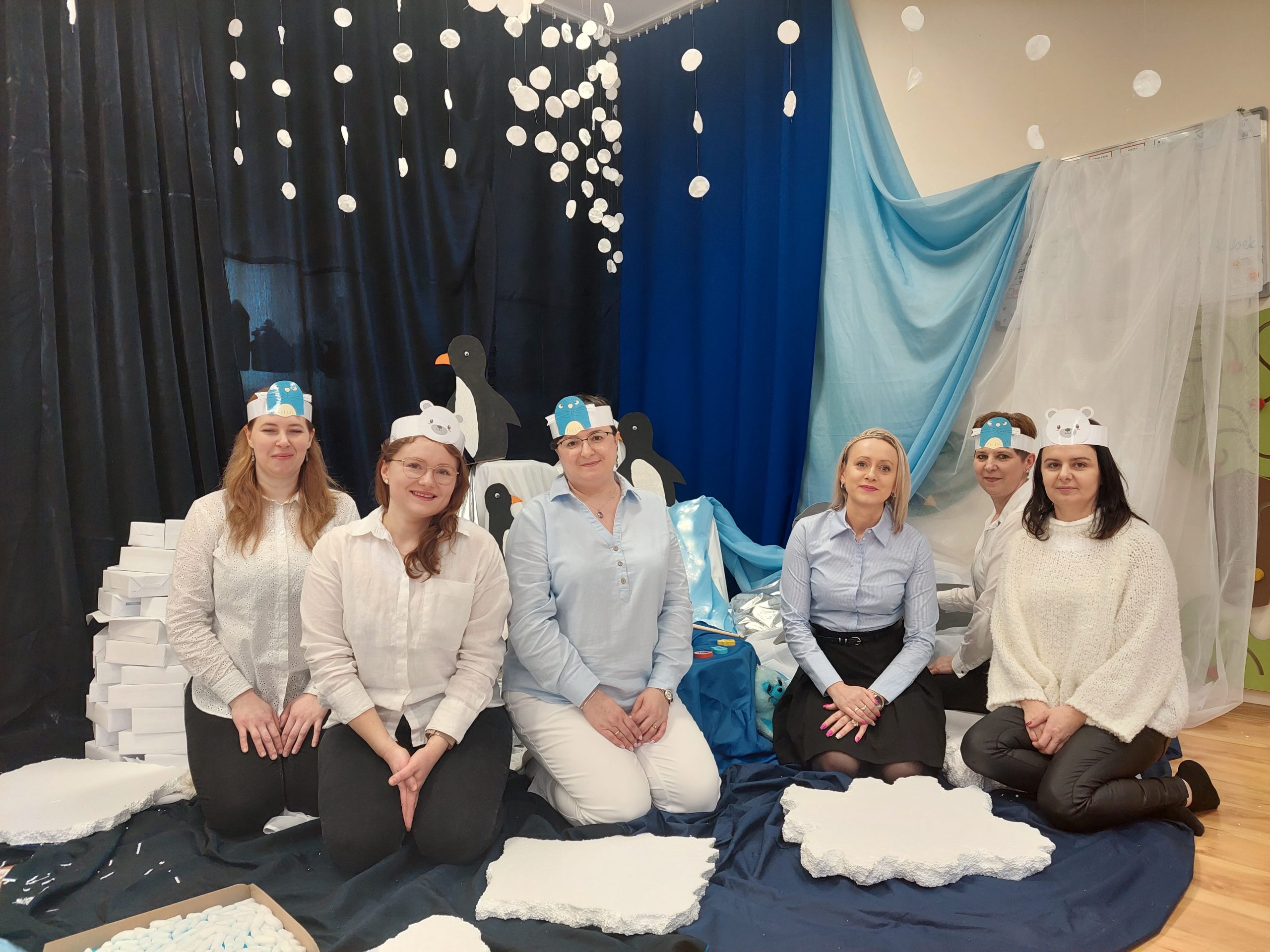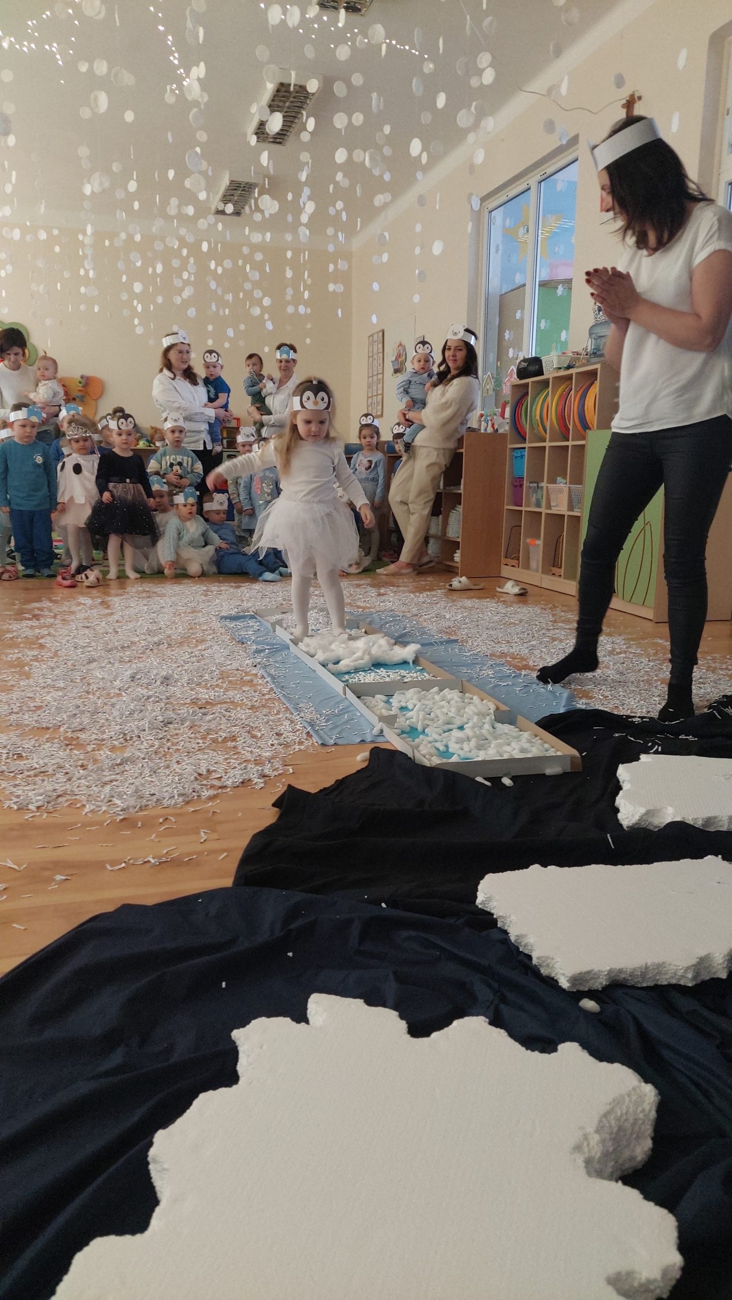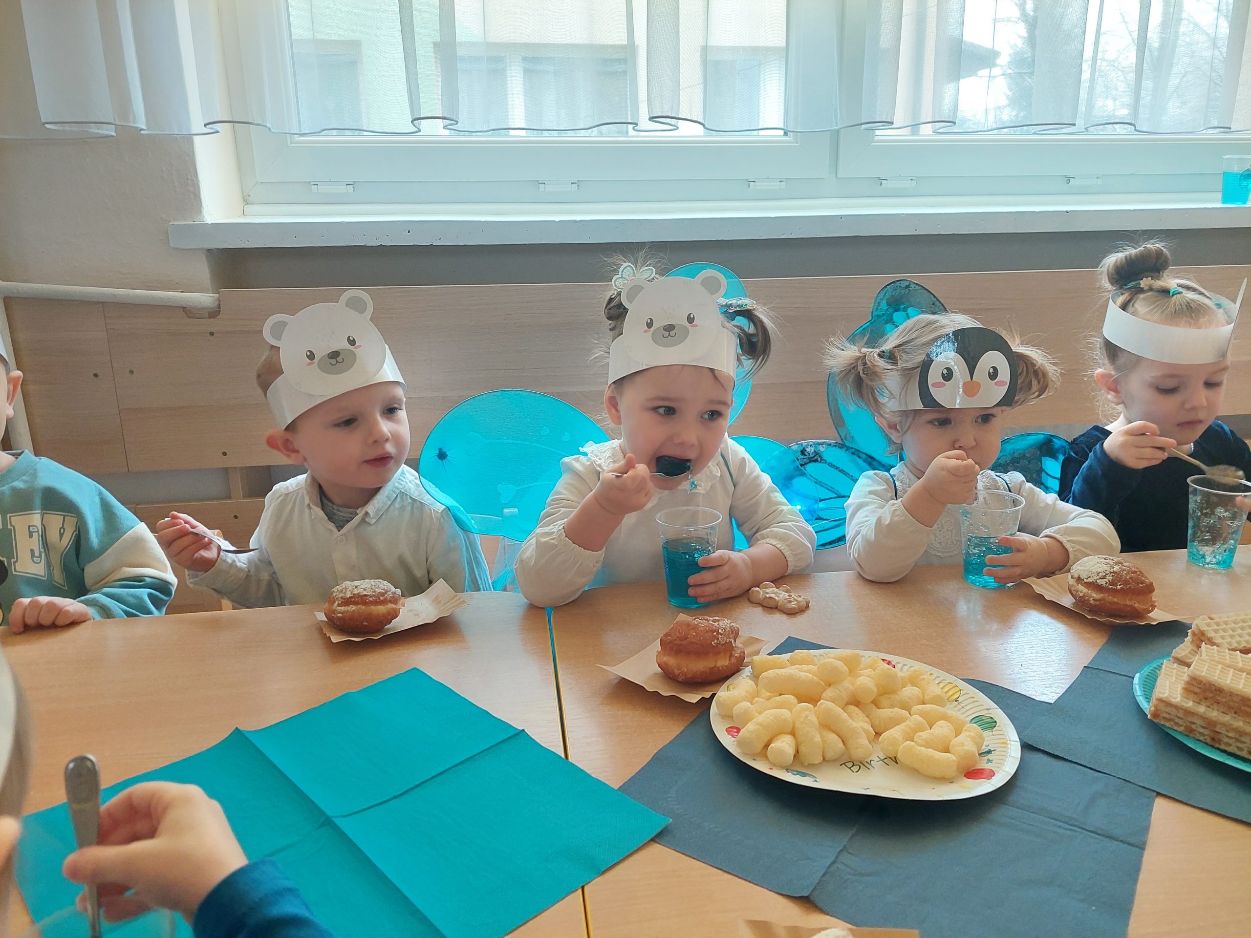 Były wspólne tańce, zabawa z chustą animacyjną, gra w kręgle z pingwinami, spacer po zimowej ścieżce sensorycznej, zabawa rytmiczna „Mam 2 pączki” i karnawałowy wąż. Po tańcach i pląsach przyszedł czas na degustację zimowych galaretek i pączków z racji Tłustego Czwartku.  Zwieńczeniem było wykonanie pamiątkowych fotografii na tle Lodowej Krainy. Bal umożliwił dzieciom spędzenie czasu w miłej atmosferze i wspólnej zabawie, która przyniosłam wiele radości.