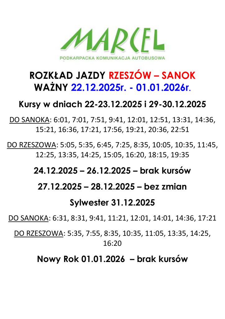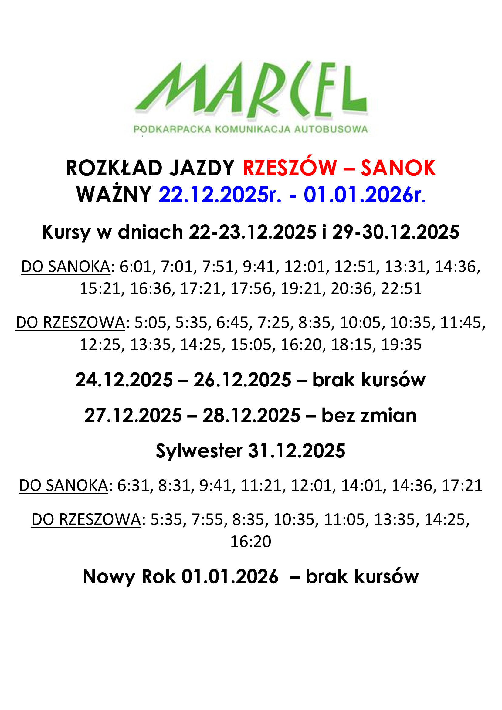 Zmiany w rozkładzie jazdy Marcel – Boże Narodzenie 2025