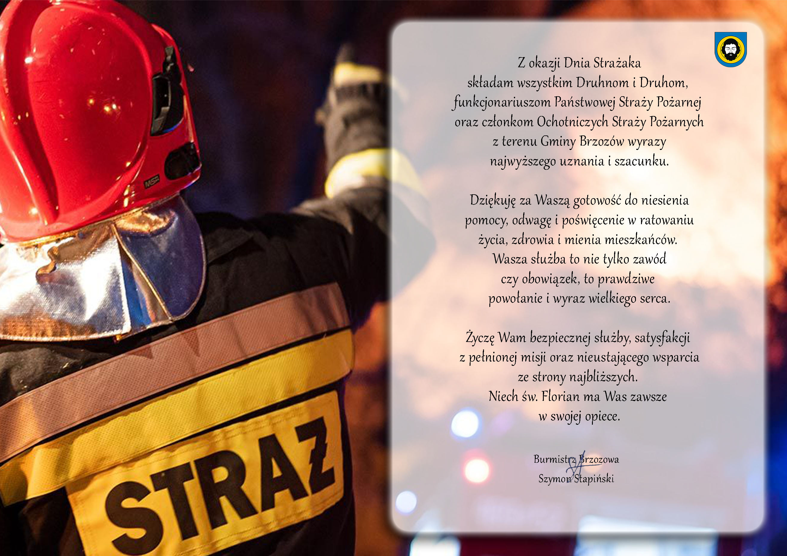 04.05.2025 Życzenia Burmistrza Brzozowa z okazji Dnia Strażaka Dziś obchodzimy Dzień Strażaka. Życzenia wszystkim druhnom i druhom składa Burmistrz Brzozowa Szymon Stapiński.