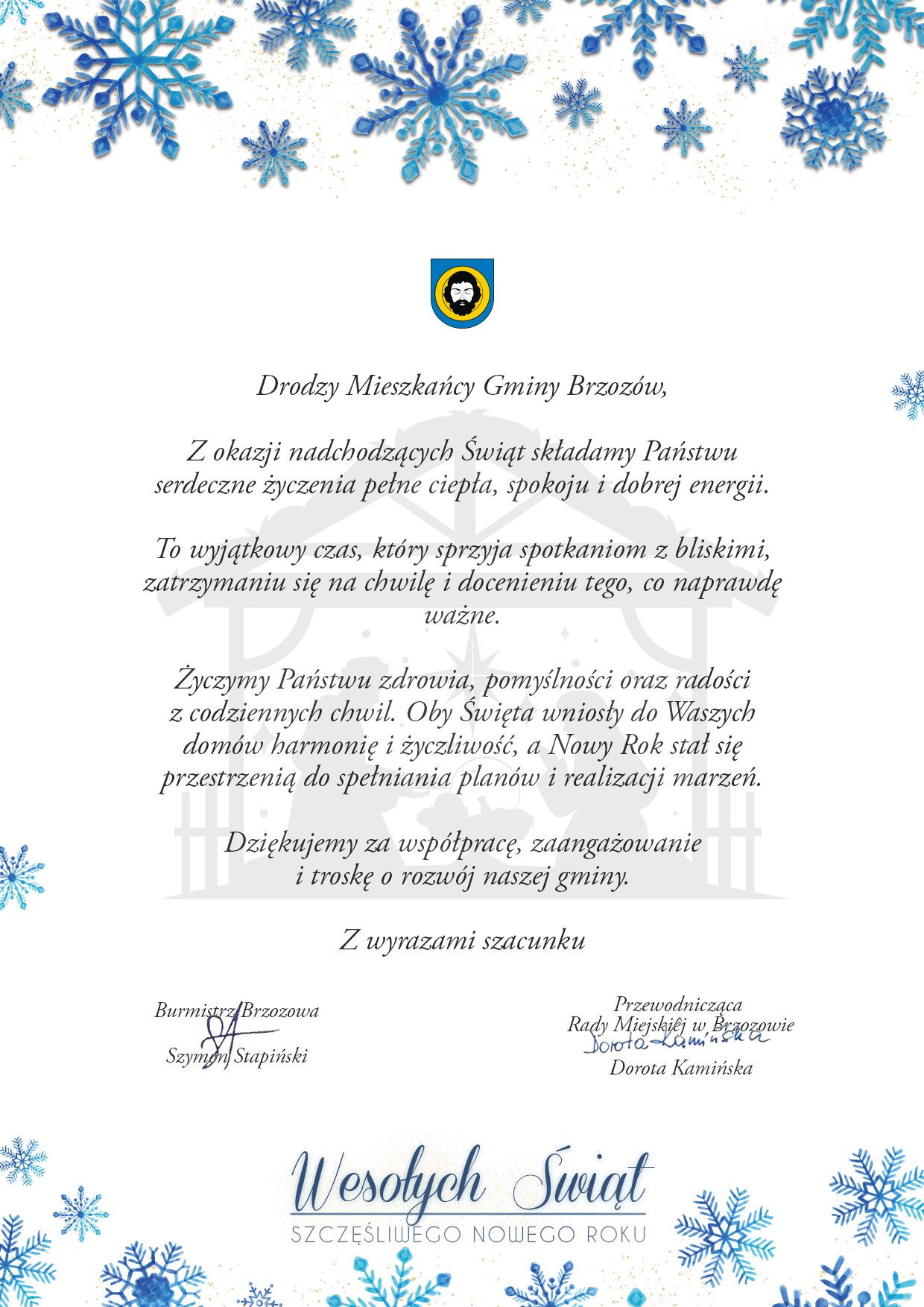 Burmistrz Brzozowa Szymon Stapiński oraz Przewodnicząca Rady Miejskiej w Brzozowie Dorota Kamińska składają życzenia świąteczne Mieszkańcom Gminy Brzozów.